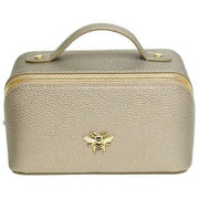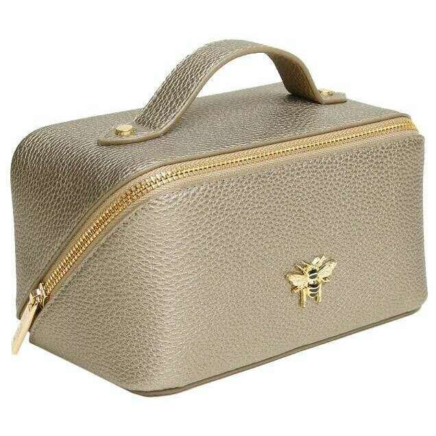 La designer Alice Wheeler London vous a apporté ce sac en faux cuir 100% végétalien pour femmes à l'aide de tons de bronze. Il mesure 9,5 cm (hauteur) x 18 cm (largeur) x 9,5 cm (profondeur). Tous les sacs sont complets dans Alice Wheeler London Packaging. L'étui Alice Wheeler London Mini Luxury Train - Bronze est une mini version du groupe de train populaire et est une façon élégamment mignonne de transporter vos articles de toilette, maquillage ou autres éléments essentiels de voyage. L'intérieur est entièrement doublé et comprend des poches internes pour vos petits bits plus en tant que double section principale, il est donc facile d'organiser vos affaires. Tout est scellé à l'intérieur en toute sécurité avec sa fermeture zippé et est fini avec l'embellissement des abeilles iconiquement magnifique.