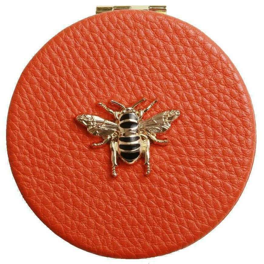 En utilisant un faux cuir à 100% végétalien, ce miroir compact rond d'Alice Wheeler London est parfait pour les femmes et un must. Il mesure 7 cm (hauteur) x 7 cm (largeur). Il est recommandé de s'essuyer avec un tissu humide pour garder ce compact en bon état. Tous les compacts sont complets dans Alice Wheeler London Packaging. Le miroir compact Round Alice Wheeler London - Orange est l'accessoire parfait qui est essentiel à emporter avec vous dans votre sac à main. L'embellissement d'abeille magnifiquement emblématique orne l'avant. À l'intérieur se trouve un miroir d'agrandissement 7x avec un cadre métallique à deux tons dorés qui est idéal pour ces retouches quotidiennes.