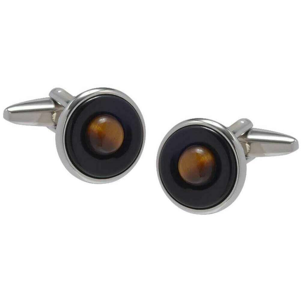 • Inspiré par les anneaux de Saturne, centre cabochon oeil de tigre, milieu en pierre d'onyx, pierres semi-précieuses naturelles, bascule de bouton de manchette standard