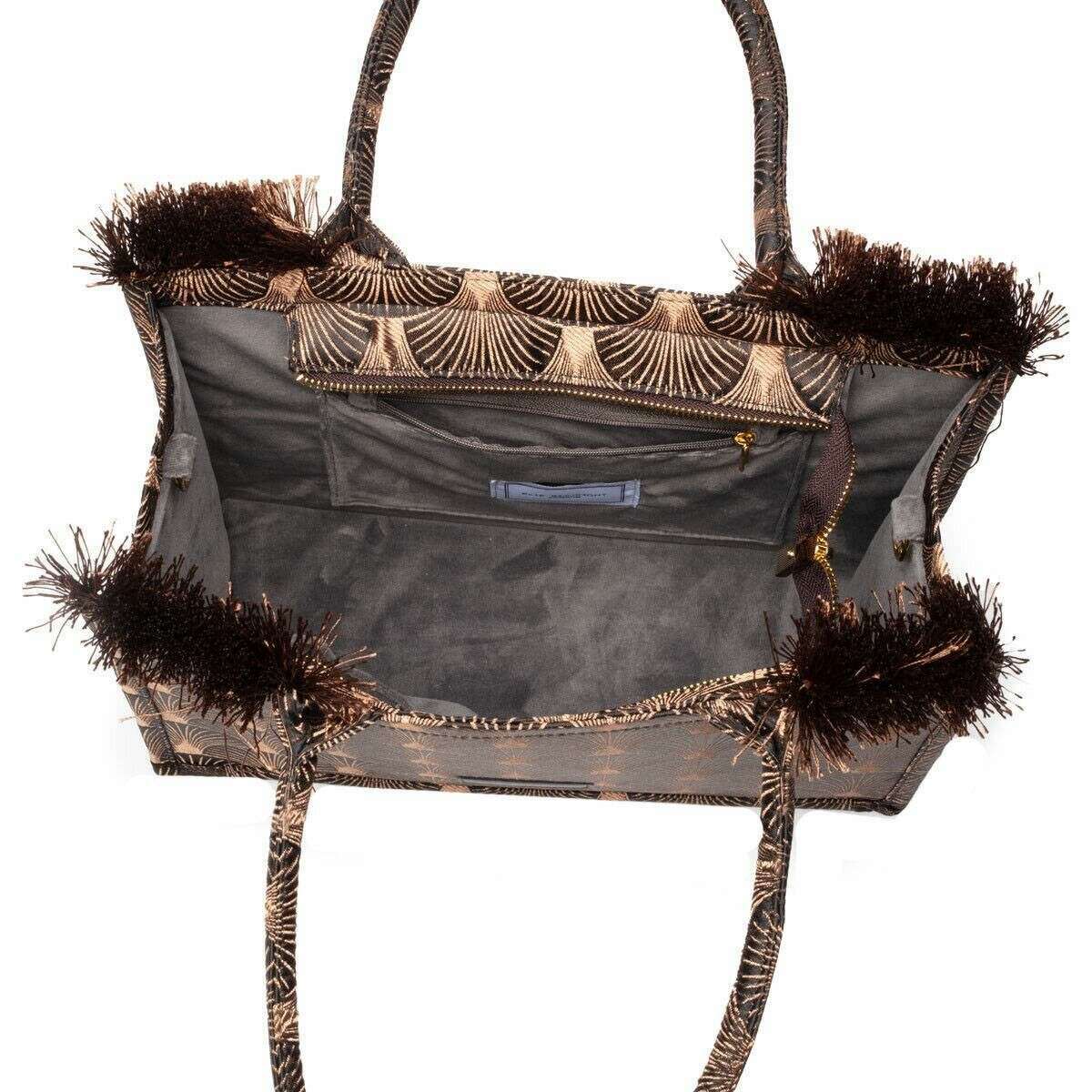 Ce sac fourre-tout midi en tissu pour femmes de la marque Elie Beaumont est fabriqué à partir de tissu 100% et est présenté en noir. Elie Beaumont a fait ce sac fourre-tout en tissu midi en Italie. Tous les sacs sont livrés avec Elie Beaumont Packaging. Le sac fourre-tout MIDI Elie Beaumont Fabric - Black Copper Fan élève votre style quotidien alors que ce magnifique fourre-tout est conçu pour le style et la fonctionnalité. Fabriqué à partir de tissu durable et de haute qualité, ce fourre-tout est parfait pour les courses quotidiennes, les éléments essentiels de travail ou les sorties de week-end. Son compartiment principal spacieux est généreusement dimensionné pour contenir facilement des livres, des courses ou votre ordinateur portable et la poche zippée interne est idéale pour garder vos objets de valeur en sécurité et facilement accessibles. Transportez confortablement avec les sangles à double transport et les détails des glands ajoutent une touche d'élégance.