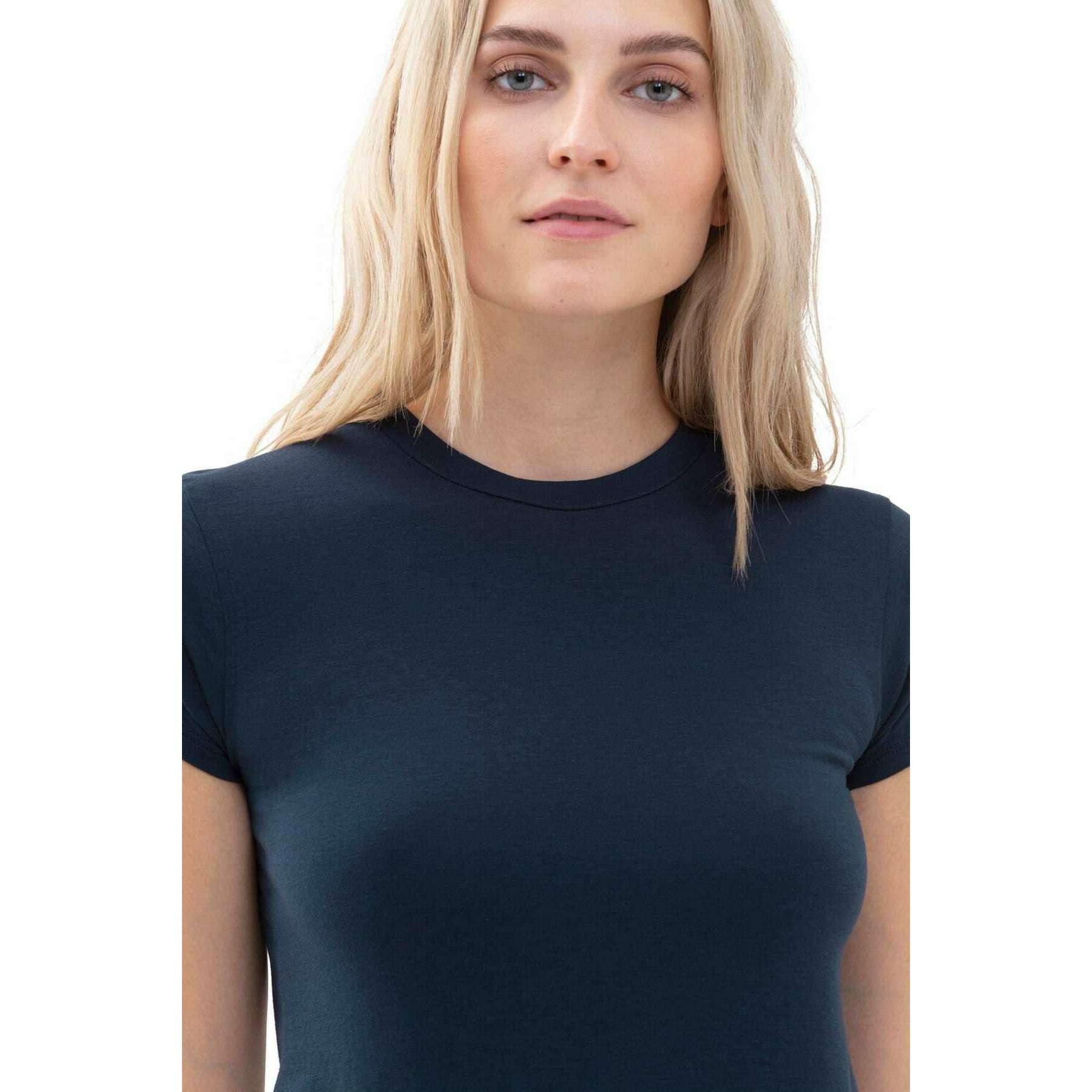 Ce top à manches courtes en pur coton pour femme est confectionné par la marque Mey dans un coloris bleu et est composé à 94% de coton et 6% d'élasthanne. De plus le t-shirt bleu nuit est conçu dans un motif uni, Il est recommandé de le laver en machine à 60 degrés pour garder ce t-shirt en bon état. Tous les t-shirts sont livrés avec mon emballage. Le haut à manches courtes Mey Cotton Pure - Bleu nuit présente des manches 1/2 et une encolure ronde avec un col roulé subtil, mêlant simplicité épurée et élégance sportive. Conçu pour un ajustement incroyable, il offre un confort exceptionnel et une sensation naturellement agréable contre la peau. Doux, respirant et facile à porter, c'est l'essentiel parfait pour le confort au quotidien.