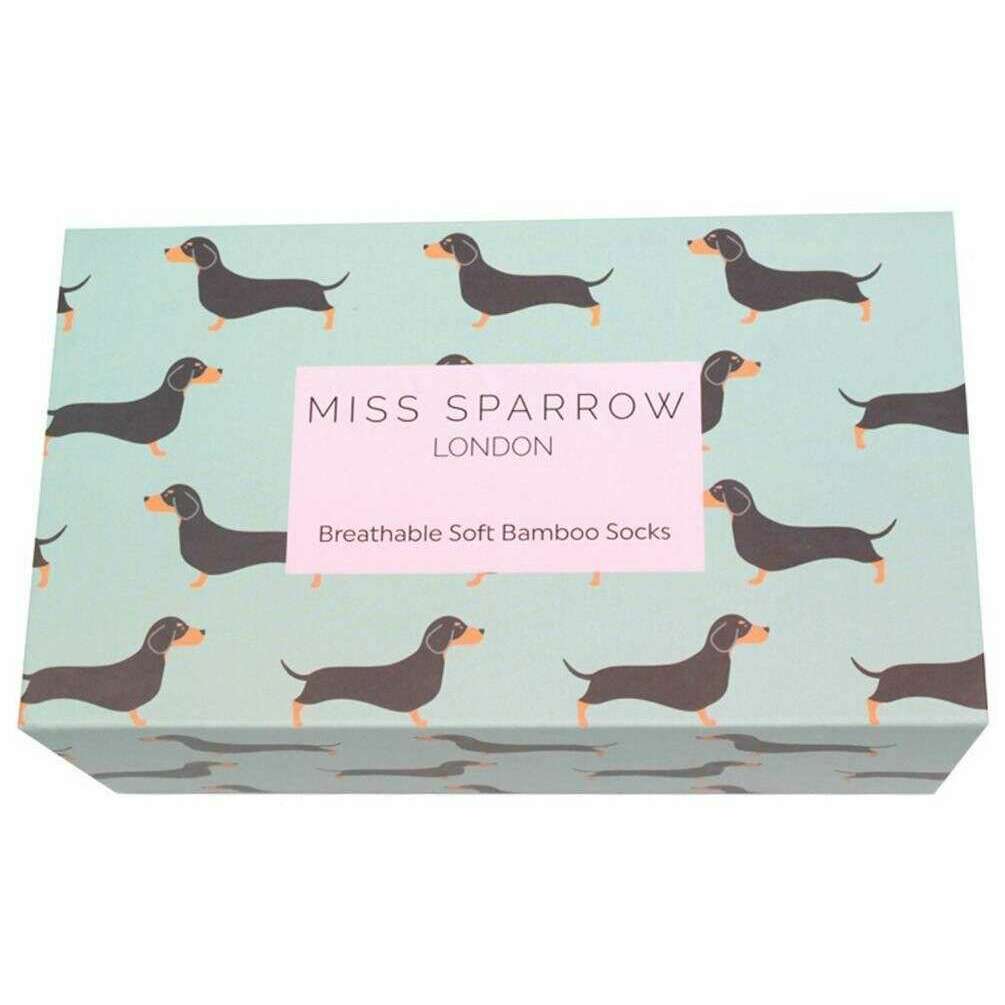Miss Sparrow London Lot de 3 boîtes à chaussettes Little Sausage Dogs – Bleu/Vert/Jaune