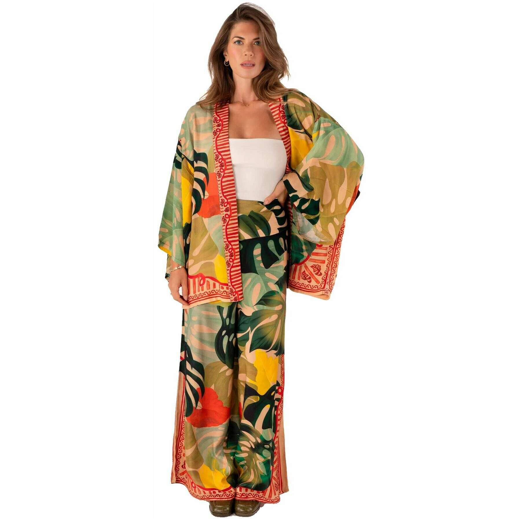 Veste Kimono Feuilles Exotiques Poudre - Vert/Beige/Jaune