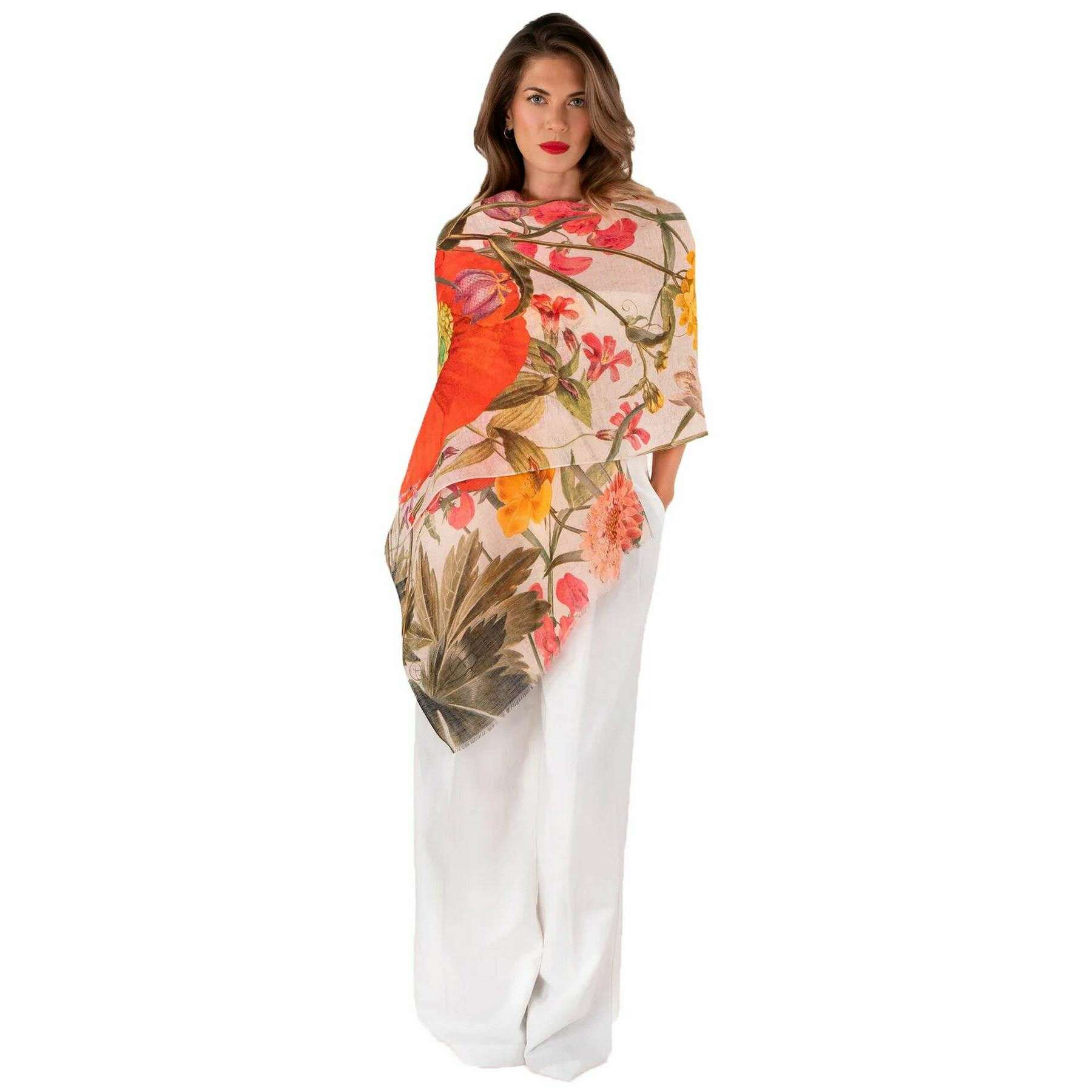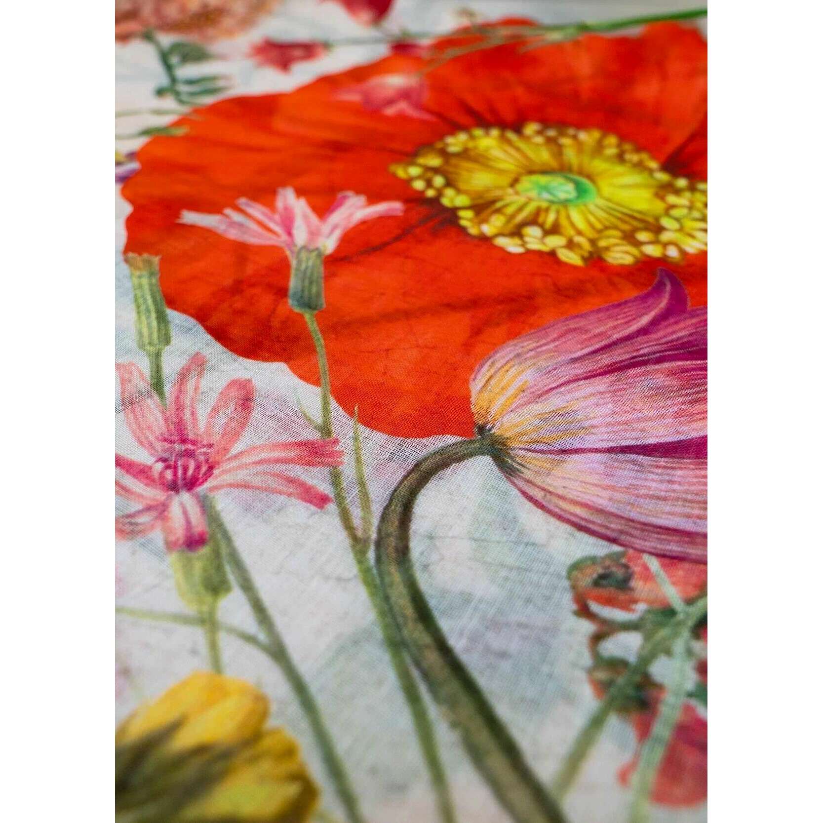 Écharpe en Lin et Coton Fleurs Fines Poudre - Beige/Rouge/Jaune