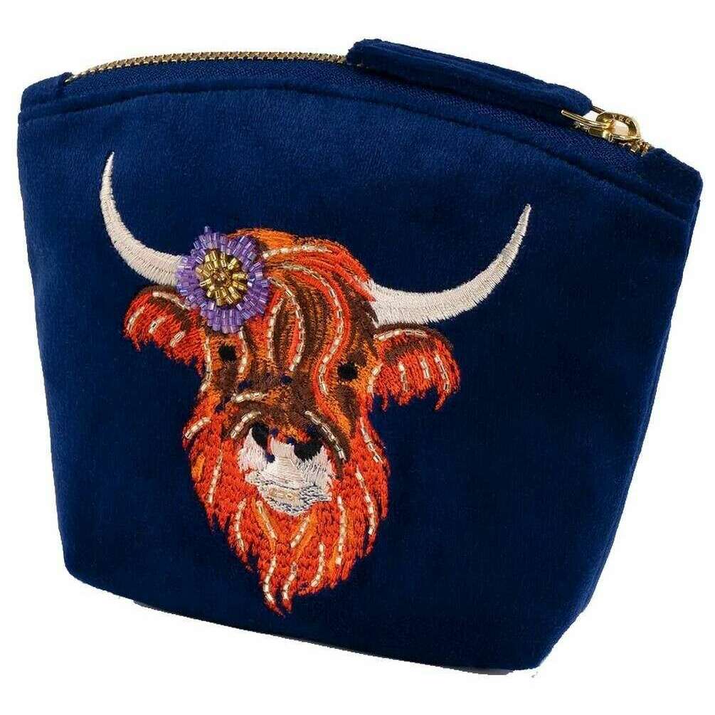 Mini Pochette en Velours Brodé Powder Highland Cow - Bleu Marine/Orange/Beige
