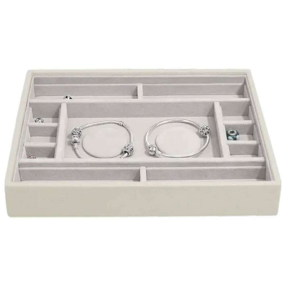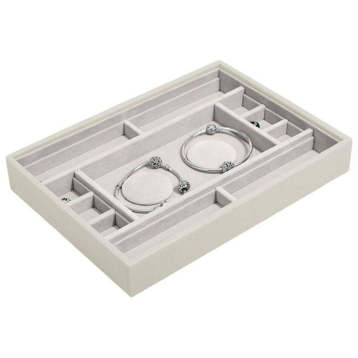 Utilisant du faux cuir crème et du velours, cette couche multi-bracelets classique de Stackers est parfaite pour les femmes et un incontournable. Il mesure 3,7 cm (hauteur) x 25 cm (largeur) x 18 cm (profondeur). Il est recommandé de l'essuyer pour conserver cette boîte à bijoux en bon état. Toutes les boîtes à bijoux sont livrées avec un emballage stacker. Le Stackers Classic Multi-Bracelet Layer - Oatmeal Cream comprend 2 coussinets de bracelet pour stocker les bracelets à breloques terminés ainsi que plusieurs compartiments pour les breloques supplémentaires. Les sections latérales ont été conçues pour accueillir 4 barres de charme courtes ou 2 barres de charme longues avec les séparateurs retirés. Ce plateau peut être ajouté à d'autres couches pour créer la boîte à bijoux parfaite ou utilisé seul.