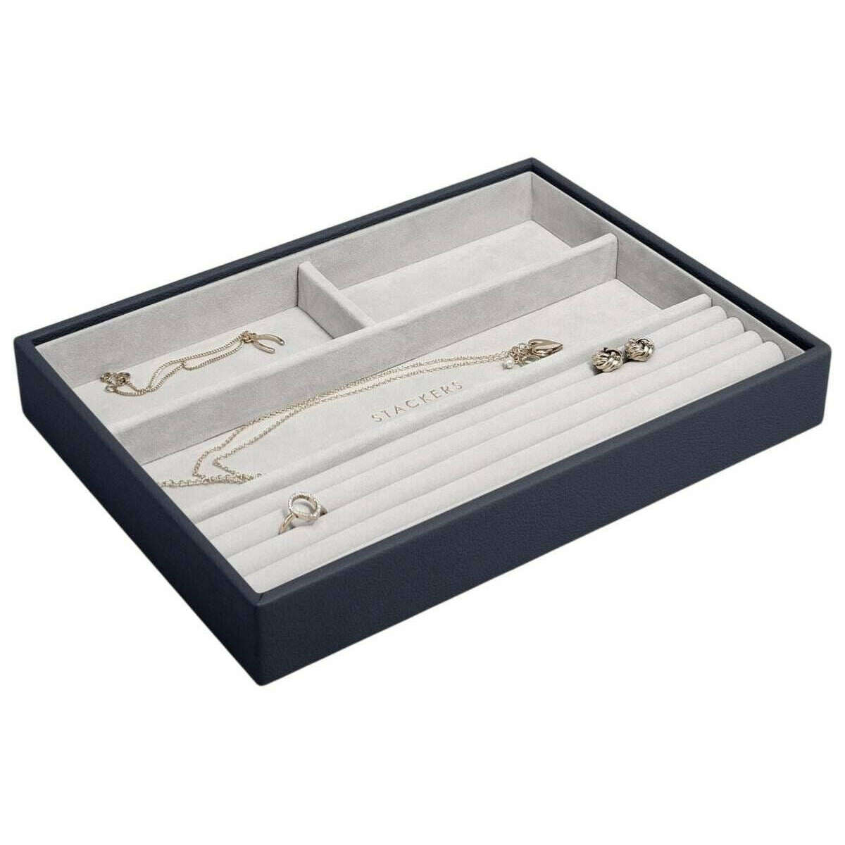 Parfait pour les femmes, ce bracelet à bague classique bleu marine Stackers est également fabriqué à partir de faux cuir et de velours. Il mesure 3,7 cm (hauteur) x 25 cm (largeur) x 18 cm (profondeur). Il est recommandé de l'essuyer pour conserver cette boîte à bijoux en bon état. Toutes les boîtes à bijoux sont livrées avec un emballage stacker. Le Stackers Classic Ring Bracelet Layer - Navy Blue est doté d'un rouleau d'anneaux intégré pour empêcher les bagues de se perdre. Ce plateau a été fabriqué avec une grande section pour les bracelets et colliers, et deux sections plus petites pour les autres objets précieux à garder en sécurité. Étant un excellent article pour tout amateur de bijoux, faites-en le cadeau parfait.