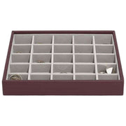 Le designer Stackers vous propose cette boîte à bijoux pour femme en simili cuir et velours dans des tons bordeaux. Il mesure 3,7 cm (hauteur) x 25 cm (largeur) x 18 cm (profondeur). Il est recommandé de l'essuyer pour conserver cette boîte à bijoux en bon état. Toutes les boîtes à bijoux sont livrées avec un emballage stacker. Le Stackers Classic Trinket Layer - Burgundy est une excellente couche pour les petits bijoux tels que des bagues, des boucles d'oreilles ou des charms. Offrant 25 compartiments égaux, c'est un organisateur simple mais pratique pour vos bijoux en vrac afin qu'ils puissent être rangés en toute sécurité au même endroit lorsque vous avez besoin de les saisir. La doublure en velours somptueux est douce contre vos accessoires, les gardant dans un état impeccable. Cette pièce peut être associée à d'autres pièces Stackers pour créer une boîte à bijoux sur mesure répondant à vos besoins.