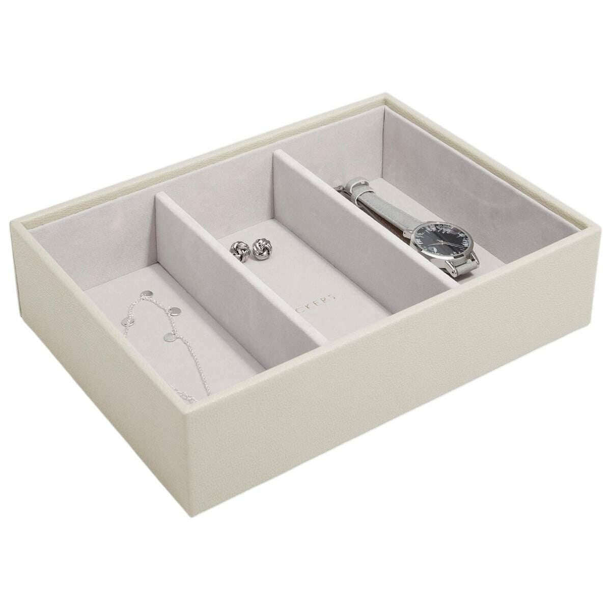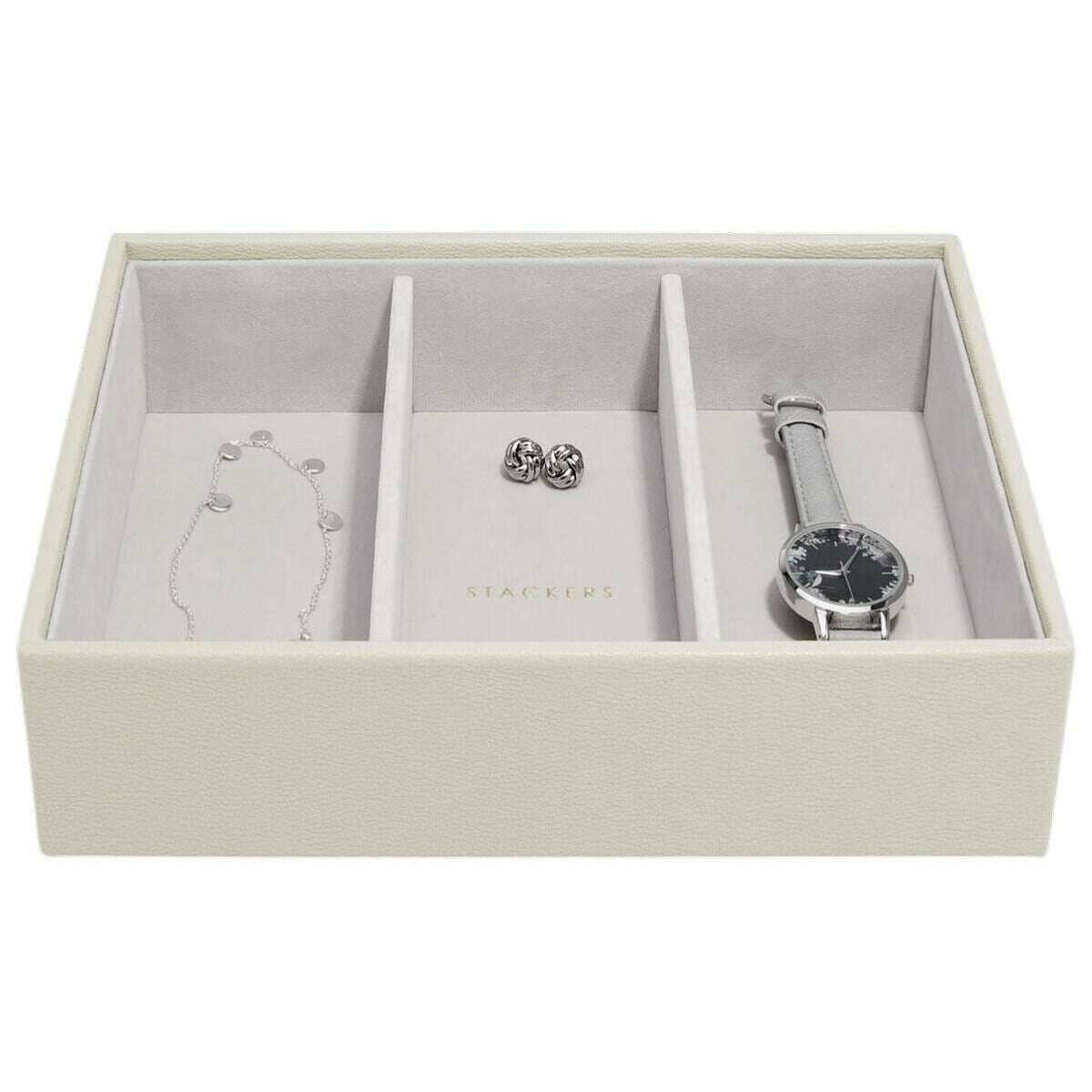 Cette couche d'accessoires de montre classique pour femme bien conçue de Stackers est de couleur crème avoine et est fabriquée à partir de faux cuir et de velours. Il mesure 6 cm (hauteur) x 25 cm (largeur) x 18 cm (profondeur). Il est recommandé de l'essuyer pour conserver cette boîte à bijoux en bon état. Toutes les boîtes à bijoux sont livrées avec un emballage stacker. La couche d'accessoires pour montre Stackers Classic - Crème d'avoine est parfaite pour ranger des verres et des accessoires plus grands et peut être utilisée comme rangement dans un tiroir ou empilée avec d'autres couches de la collection Stackers pour créer une boîte à bijoux personnalisée. Idéale pour les femmes qui aiment accessoiriser, cette jolie couche est élégante et intelligente et a été fabriquée professionnellement à partir de matériaux de haute qualité.