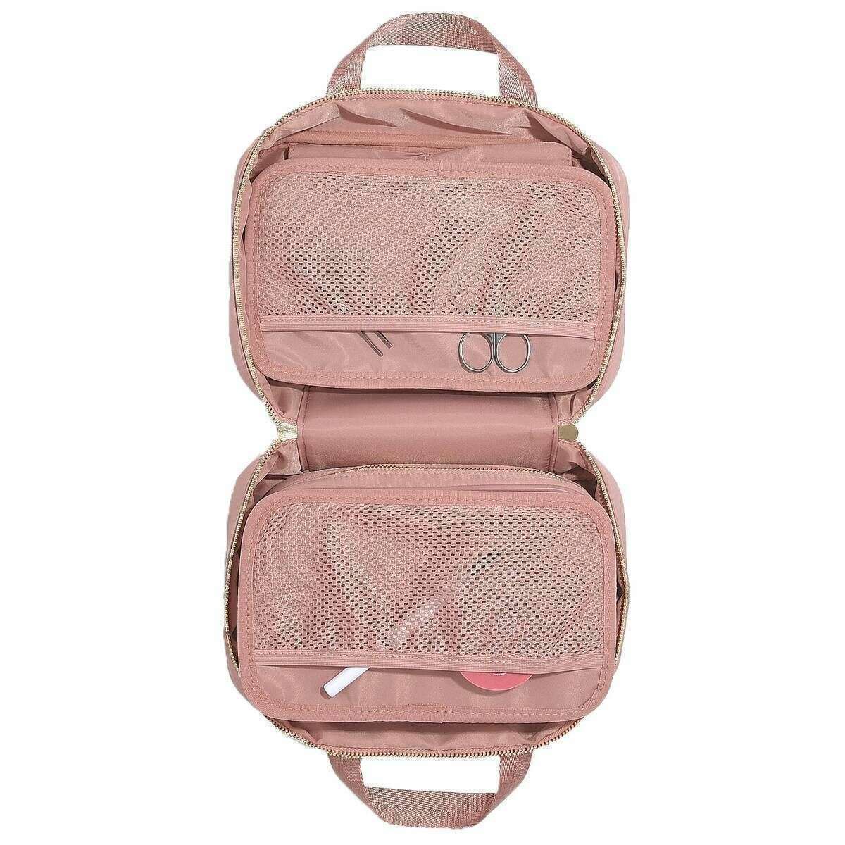• 4 sections, mécanisme de pliage et zip, 2 poignées de transport, crochet suspendu en haut, compartiments multiples, poches zippées, boucles élastiques, section amovible, miroir compact inclus