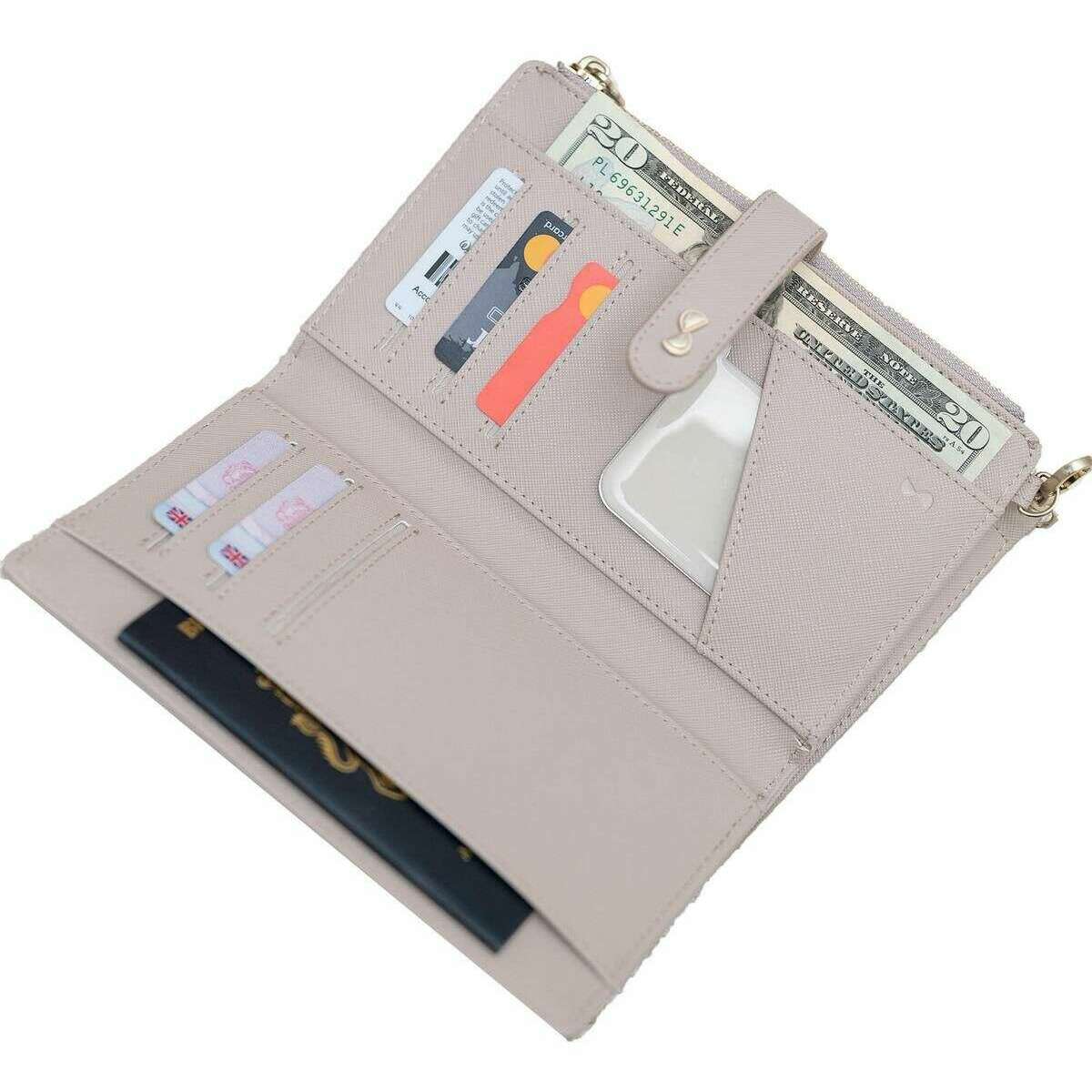 • Poche externe pour téléphone , 6 emplacements pour cartes , Miroir cosmétique , Poche à monnaie zippée amovible , Dragonne amovible , Fermeture à bouton-pression