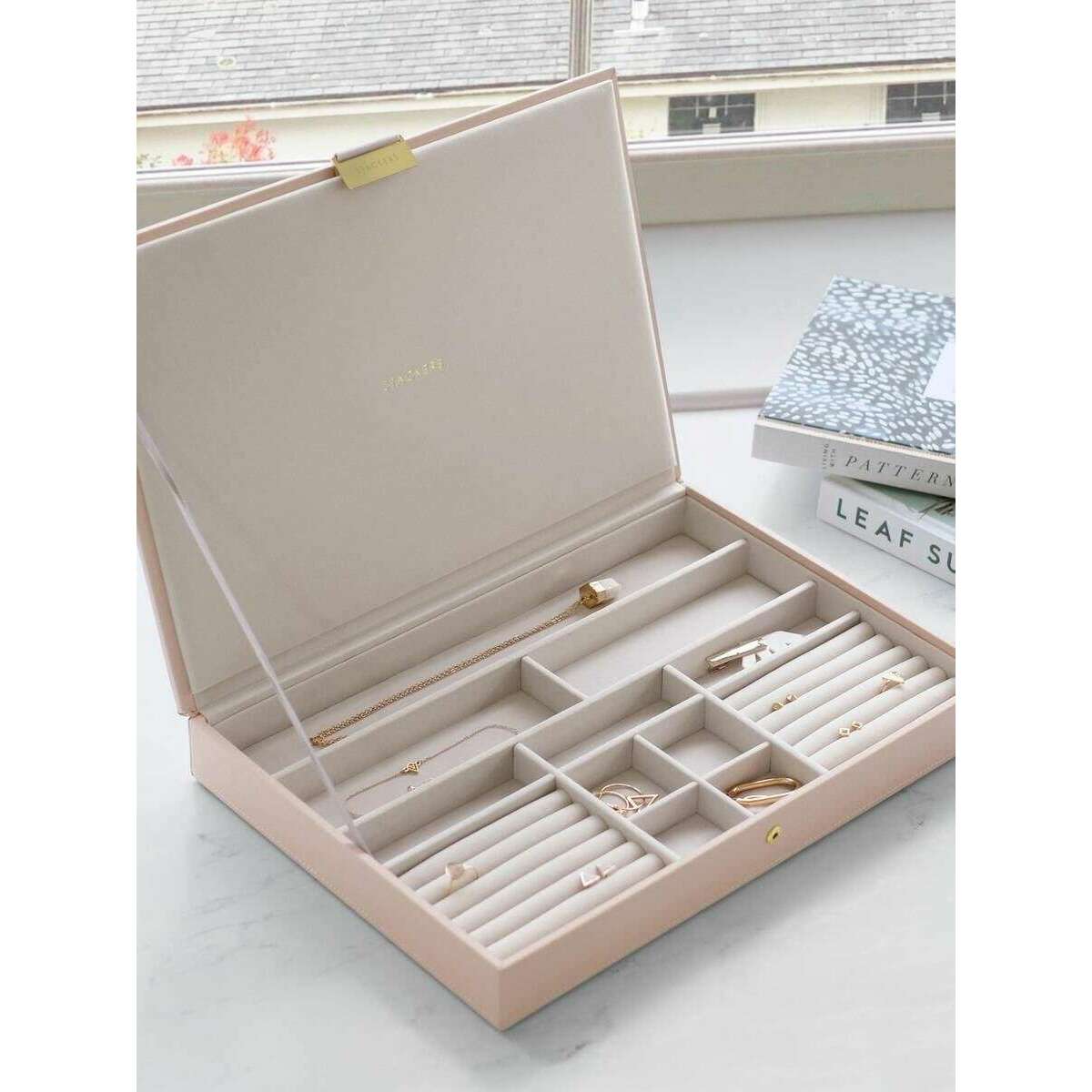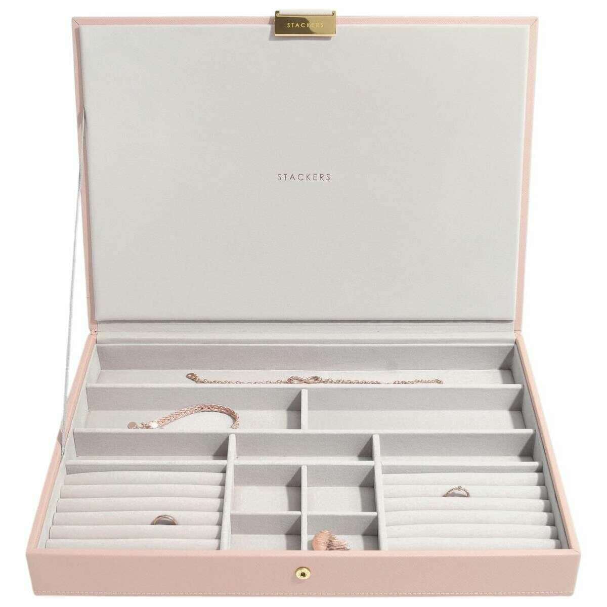 Présenté par la marque Stackers, ce couvercle de boîte à bijoux surdimensionné pour femme rose blush/or est fabriqué en simili cuir et en velours. Il mesure 4,7 cm (hauteur) x 36 cm (largeur) x 23,9 cm (profondeur). Il est recommandé de l'essuyer pour conserver cette boîte à bijoux en bon état. Toutes les boîtes à bijoux sont livrées avec un emballage stacker. Le couvercle de boîte à bijoux Supersize Stackers - Rose Blush/Or est le point de départ idéal pour construire votre boîte à bijoux surdimensionnée ou agira comme un support idéal seul à conserver dans vos tiroirs ou votre vanité. Le couvercle peut être sécurisé grâce à sa fermeture à bouton-pression et s'ouvre pour révéler une sélection de sections, chacune conçue pour donner à vos bijoux une organisation optimale. Il présente un magnifique intérieur en velours qui agit comme un support doux pour vos précieuses pièces.