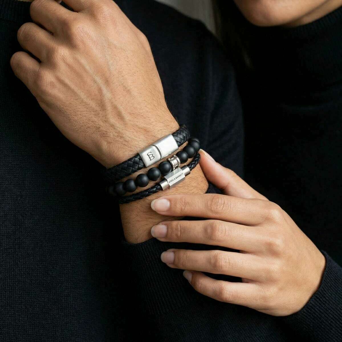 Présentation de ce coffret cadeau triple bracelet pour hommes de Steel & Barnett, il est fabriqué à partir de 100 % de cuir, d'acier inoxydable et de pierres précieuses de couleur noir/argent. Tous les bracelets sont livrés avec un coffret cadeau en acier et Barnett. Le coffret cadeau triple bracelet Steel & Barnett - Noir/Argent présente un trio élégant et sophistiqué conçu pour l'individu moderne qui valorise le style raffiné et la polyvalence. Cet ensemble comprend un bracelet en acier inoxydable, un bracelet en cuir et un bracelet en pierres précieuses rondes de 6 mm, chacun confectionné dans des tons noirs qui respirent une élégance discrète. Ensemble, ces pièces créent un équilibre harmonieux de texture et de design combinant la résistance de l'acier, l'attrait intemporel du cuir et l'attrait naturel des pierres précieuses polies. Qu'il soit porté séparément pour un impact subtil ou superposé pour une déclaration plus audacieuse, l'ensemble s'adapte sans effort à n'importe quelle garde-robe.