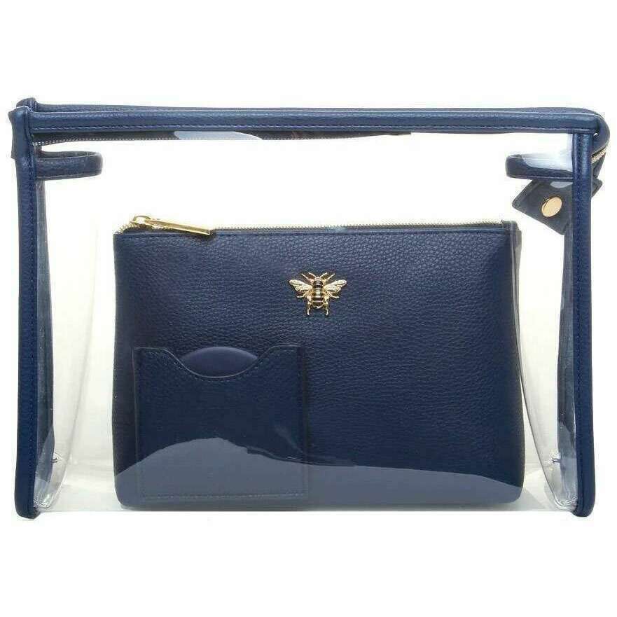 Introducing this women's 3 piece beauty set by Alice Wheeler London, it is manufactured from 100% vegan faux leather in a navy colour. It measures clear case: 21cm(height) x 30cm(width) x 8cm(depth) beauty case: 13.5cm(height) x 20cm(width) x 6cm(depth) compact: 7.4cm(height) x 8.2cm(width). It is recommended to wipe clean with damp cloth to keep this bag in good condition. All the bags come complete in alice wheeler london packaging. The Alice Wheeler London 3 Piece Beauty Set - Navy will make a superb addition to your collection, giving you 2 storage cases and a handy compact mirror. The clear case is perfect for travelling while the stylish make-up bag will look elegant on your dresser and will keep all of your beauty products in one place. Both the make-up bag and compact are embellished with the beautifully iconic Honeybee. This set is perfect as a gift idea.