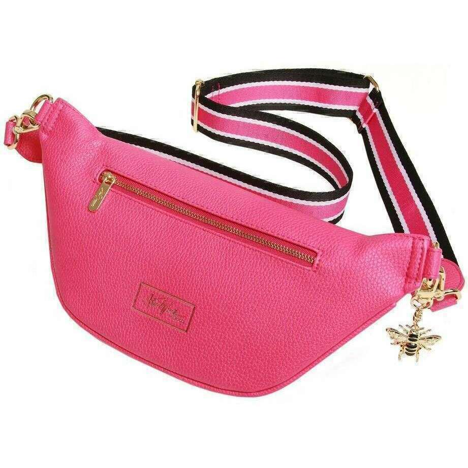 Using pink 100% vegan faux leather, this banana bag by Alice Wheeler London is perfect for women and a must have. It measures 14cm(height) x 29cm(width) x 9cm(depth). It is recommended to wipe clean with damp cloth to keep this bag in good condition. All the bags come complete with alice wheeler london packaging. The Alice Wheeler London Banana Bag - Hot Pink is the perfect choice of you are looking for a more casual accessory, but that doesn’t mean it sacrifices elegant style. It is fitted with a tri-colour strap which is easily adjustable to find the ideal carrying comfort. Inside is a good-sized main compartment as well as a smaller zipped pocket which is perfect for storing your more valuable items. Finished with a gorgeous Honey Bee charm this piece will certainly become a staple.
