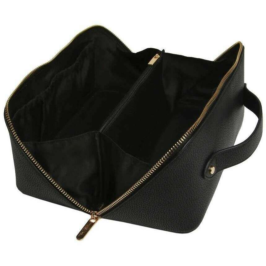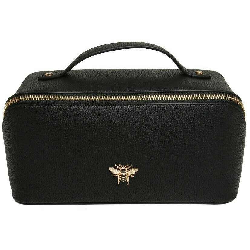 This women's large luxury train case by the brand Alice Wheeler London is made from 100% vegan faux leather and is showcased in black. It measures 13cm(height) x 26cm(width) x 13cm(depth). All the bags come complete in alice wheeler london packaging. The Alice Wheeler London Large Luxury Train Case - Black is a stylish way to carry your toiletries, make-up or other travel essentials. Inside is fully lined and includes internal pockets for your smaller bits plus as a dual main section so it is easy to organise your things. Everything is sealed inside securely with its zipped closure and is finished with the iconically beautiful bee embellishment.