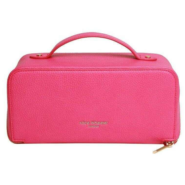 This women's luxury train case by the brand Alice Wheeler London is made from 100% vegan faux leather and is showcased in pink. It measures 12cm(height) x 24cm(width) x 12cm(depth). All the bags come complete in alice wheeler london packaging. The Alice Wheeler London Luxury Train Case - Hot Pink is the perfect travel case for toiletries when going away or storage for your make-up and beauty products. The luxury design features a zipped closure and opens up to a large main compartment with internal pockets for your smaller essentials. The top handle makes it effortless to transport and the stylish branding on both sides adds an elegant touch.