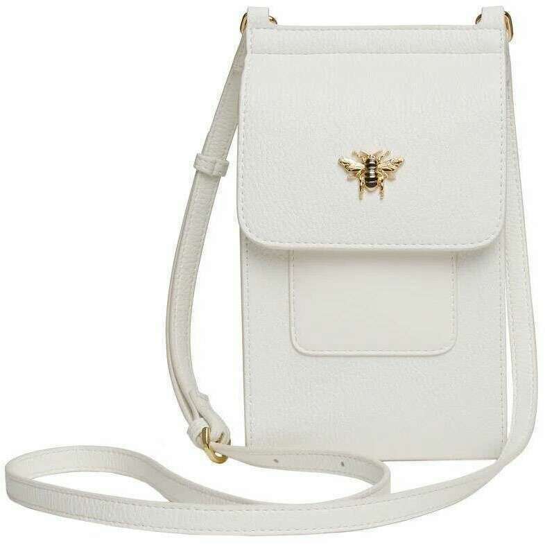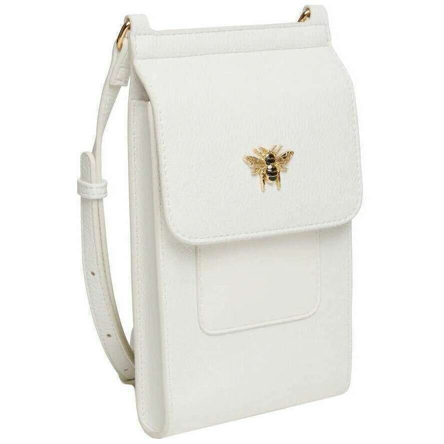 This women's mini bloomsbury crossbody bag by the brand Alice Wheeler London is made from 100% vegan faux leather and is showcased in white. It measures 20cm(height) x 12cm(width) x 3cm(depth). All the bags come complete in alice wheeler london packaging. The Alice Wheeler London Mini Bloomsbury Crossbody Bag - White is a super lightweight bag that is perfect for any occasion and any outfit. This unique design has a convenient built in card holder at the back of the bag that can hold two cards and an interior pocket that is perfect for storing your smaller items. Made from high-quality vegan faux leather means that this bag is completely eco-friendly. The famous bee logo and name branding finishes of this case giving it an elegant look.