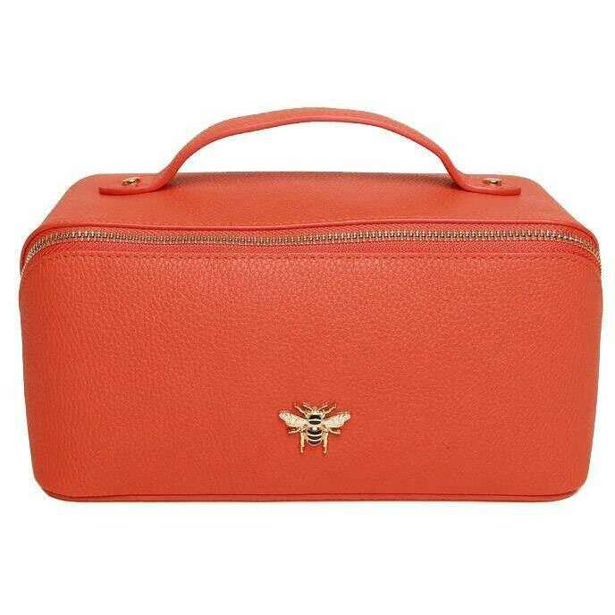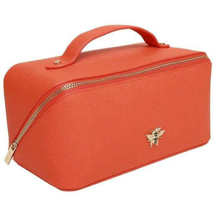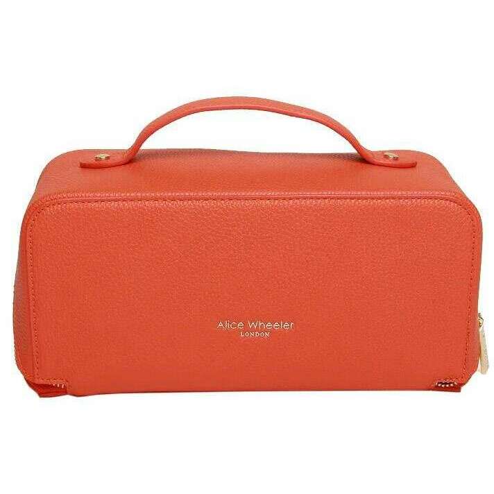 Introducing this women's mini train case by Alice Wheeler London, it is manufactured from 100% vegan faux leather in a orange colour. It measures 9.5cm(height) x 18cm(width) x 9.5cm(depth). All the bags come complete in alice wheeler london packaging. The Alice Wheeler London Mini Train Case - Orange is a travel must have. Whether for your make up or small toiletries the mini train is an essential for your collection, helping you organise your travel must-haves. The handle ensures you can transport your goods easily and carry in a stylish way. The famous bee logo and name branding finishes of this case giving it an elegant look.