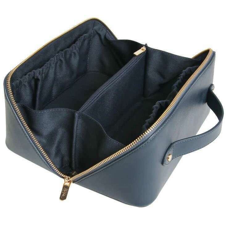 Designer Alice Wheeler London has brought you this women's 100% vegan faux leather bag using navy tones. It measures 12cm(height) x 24cm(width) x 12cm(depth). All the bags come complete in alice wheeler london packaging. The Alice Wheeler London Nappa London Train Case - Navy will make a practically stylish travel companion, giving you an accessory that will organise your essentials and look good doing it. Unzip it to find a dual compartment with internal pockets and a zipped pocket in the middle for smaller items which you don’t want to roam loose. It has a top carry handle and is finished with debossed branding.