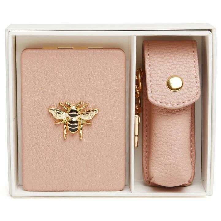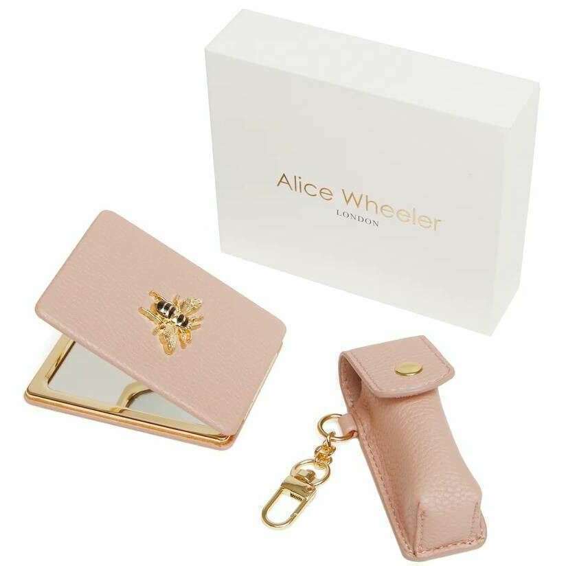 ({IF["This women's oblong compact mirror and lipstick holder gift set has been made from 100% vegan faux leather, featured in a pink colour and is from the brand Alice Wheeler London. It measures mirror - 8.5cm(height) x 6cm(width) lipstick holder - 8.5cm(height) x 3cm(width) x 3cm(depth). All the compacts come complete with alice wheeler packaging. The Alice Wheeler London Oblong Compact Mirror and Lipstick Holder Gift Set - Pink will make a stunning gift to yourself or someone you love. The beautifully iconic bee embellishment is featured on the mirror, and both have matching colours and hardware, making them a stylish matching pair. The mirror is great for everyday touch ups, and the lipstick holder is perfect for protecting your favourite everyday lipstick in style. These will be a perfect addition to your everyday bag, adding convenience."!=""]})