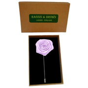 This men's rose flower lapel pin by the brand Bassin and Brown is made from rhodium plate and is showcased in lilac. It measures 8cm(height of pin) x 5cm(diameter). All the lapel pins come complete in bassin and brown recyclable box. The Bassin and Brown Rose Flower Lapel Pin - Lilac will guarantee to add a touch of elegance to your attire. Ideal for weddings and special occasions, this has a realistic effect for a beautiful overall finish.