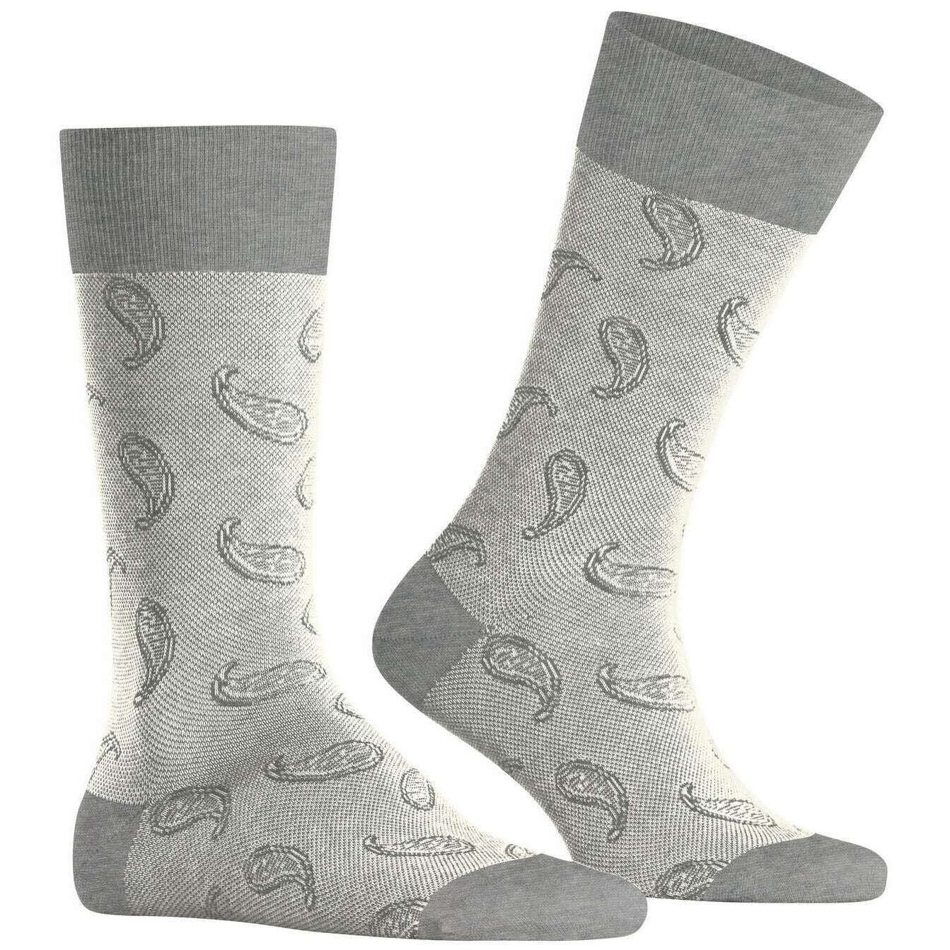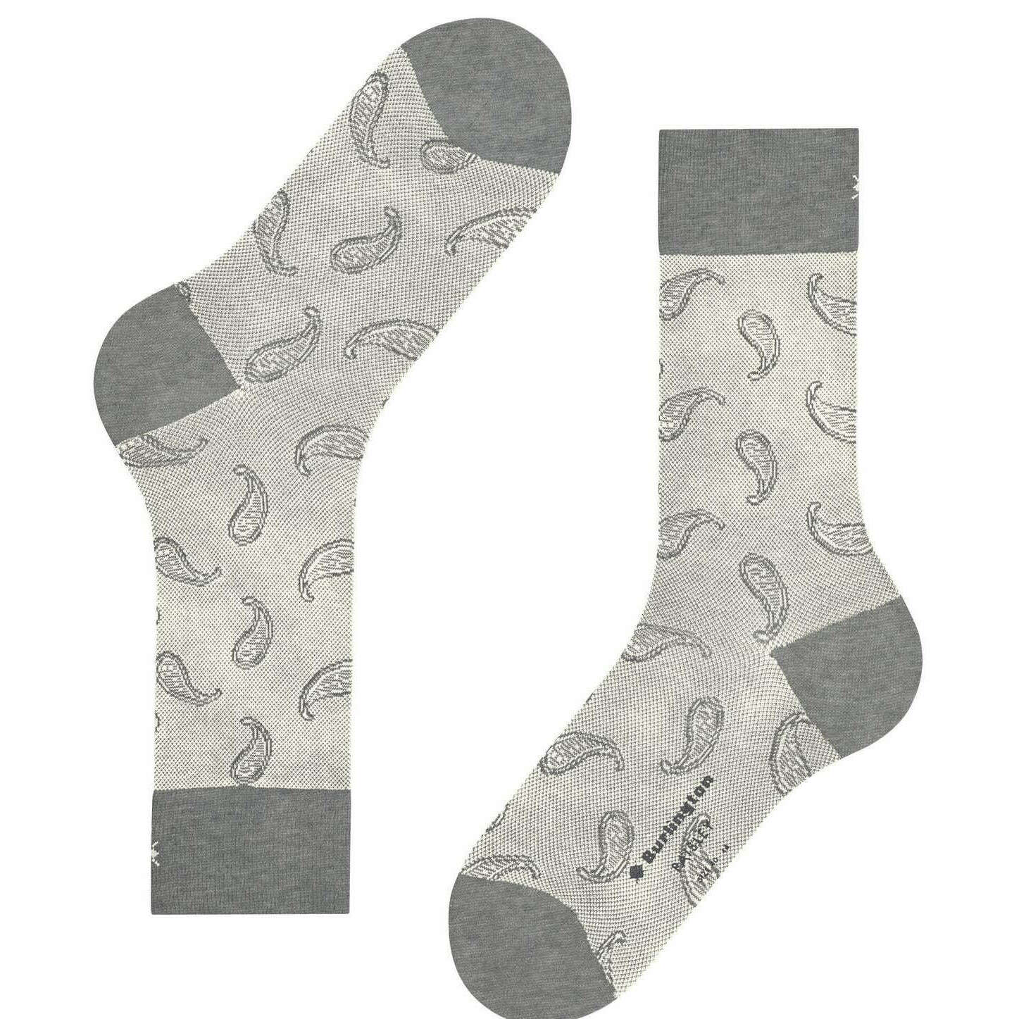 Introducing these men's paisley socks by Burlington, they are manufactured from 78% organic cotton, 21% polyamide and 1% elastane in a light grey colour. Also the light grey socks are designed in a paisley pattern, It is recommended to wash at 40 degrees to keep these socks in good condition. All the socks come complete with burlington sock tags. The Burlington Paisley Socks - Light Grey are more than just a fashion accessory, they're a statement of style, fun, and superior craftsmanship. Crafted from a blend of combed cotton, polyester, and elastane, these socks provide a breathable, comfortable fit with a hint of stretch. The high-quality materials ensure durability while maintaining a cozy, skin-friendly texture. The knitted-in Burlington logo and trendy paisley pattern adds a playful touch to any outfit and is for those seeking a fun twist in their everyday attire.