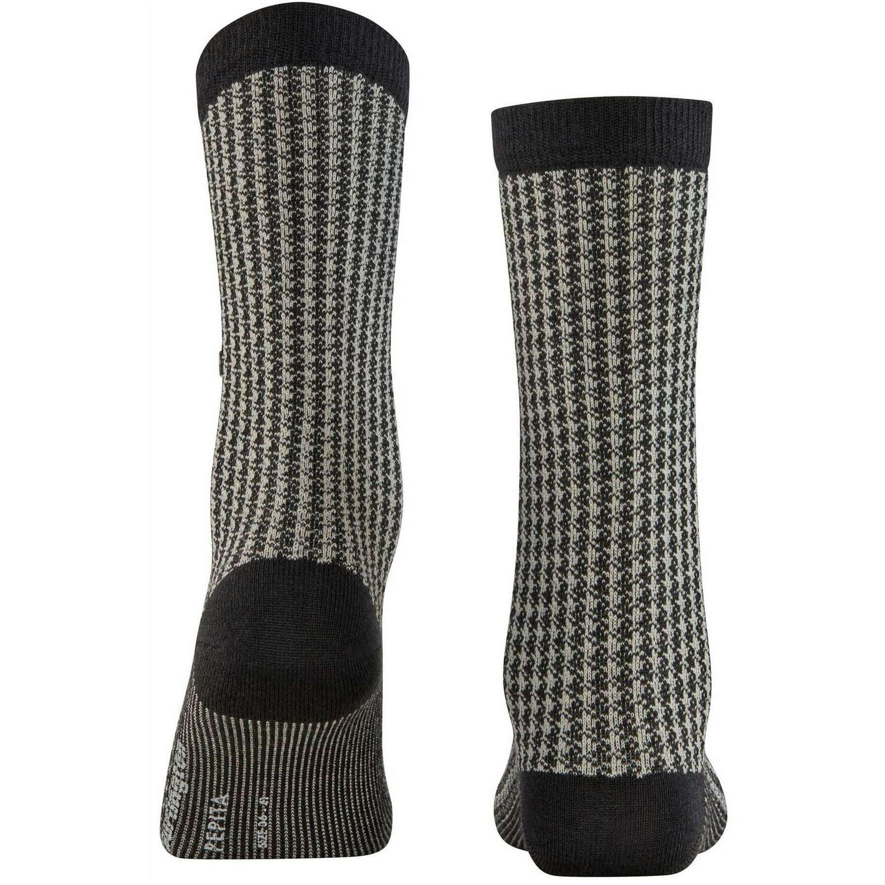 These pepita socks for women are fashioned by the brand Burlington in a black colour and are made from 73% virgin wool, 25% polyamide (8% recycled) and 2% elastane. Also the black socks are designed in a houndstooth pattern, It is recommended to wash at 30 degrees to keep these socks in good condition. All the socks come complete with burlington socks tags. The Burlington Pepita Socks - Black are a stylish, unique addition to any wardrobe, designed to add a touch of flair while ensuring comfort and durability. These socks combine the delicate houndstooth design with the iconic Burlington clip on the side to enhance any outfit. The warming wool blend keeps these socks breathable, while the stretch fabric ensures they fit comfortably without slipping.
