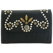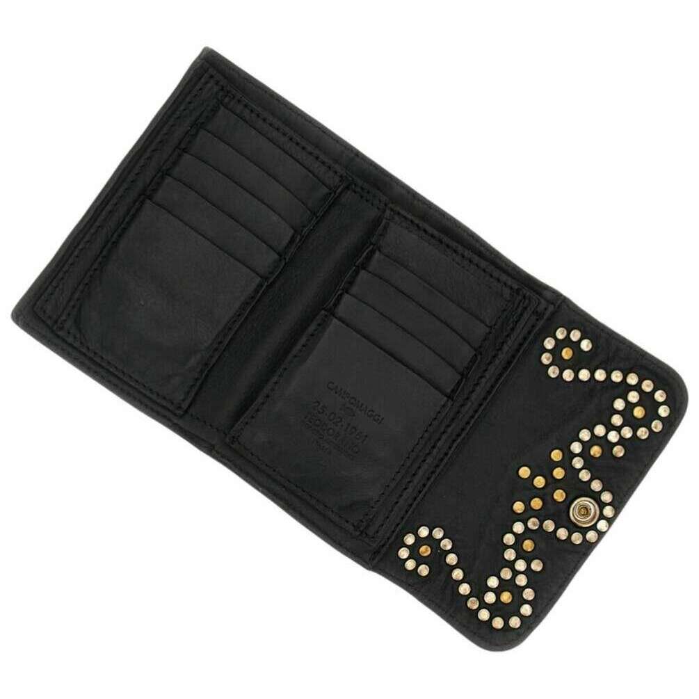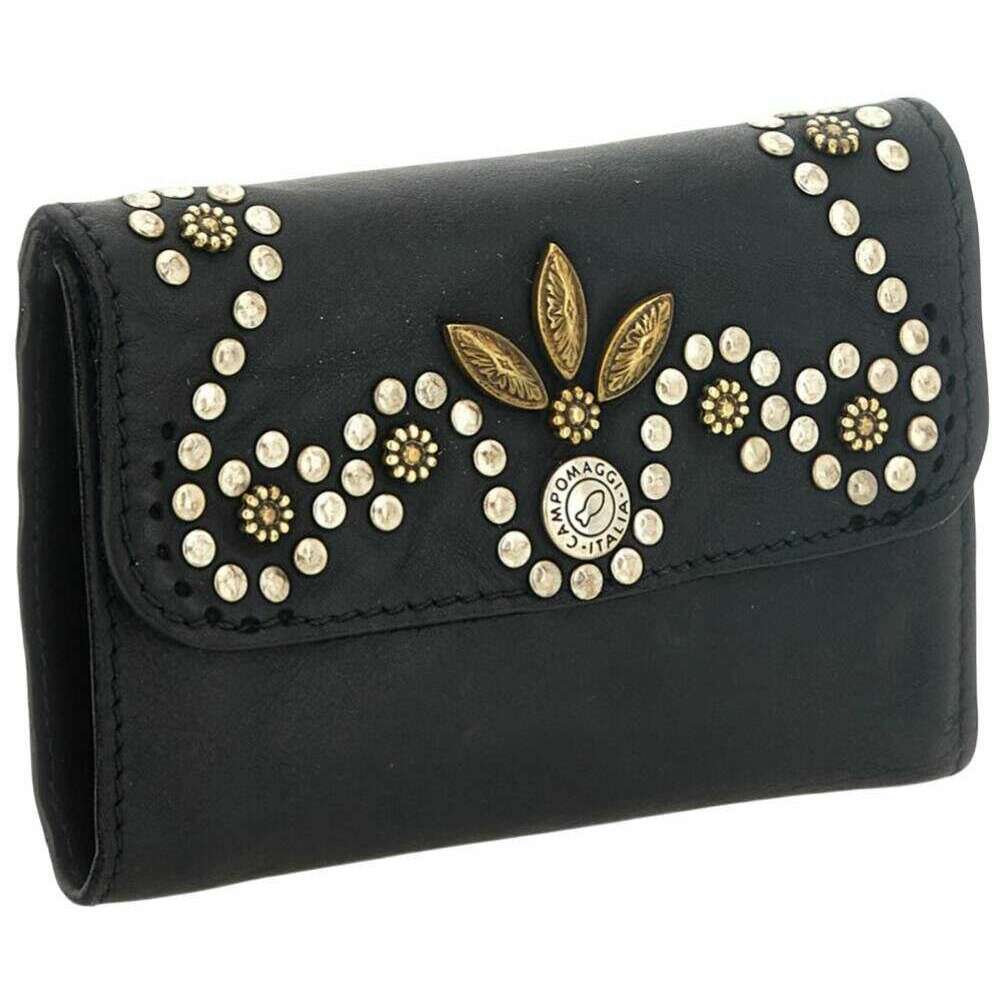 Manufactured from 100% vegtable tanned cowhide leather is this black women's mirta siena flap over purse by the designer Campomaggi. It measures 14cm(height) x 10cm(width) x 1.5cm(depth). Campomaggi have made this mirta siena flap over purse in Italy. All the purses come complete with campomaggi packaging. The Campomaggi Mirta Siena Flap Over Purse - Black is a refined accessory that showcases the brand s distinctive Italian craftsmanship. Made from premium vegetable?tanned cowhide leather, it develops a rich patina over time, reflecting the natural beauty and durability of the material. The front is adorned with an elegant stud design, adding a subtle decorative touch that enhances its classic silhouette. Secured with a press stud closure, the purse opens to reveal a thoughtfully organised interior featuring three compartments and ten card holders ideal for keeping cards, cash, receipts, and essentials neatly arranged. Despite its structured layout, the design remains slim and easy to carry, making it perfect for everyday use. Handmade in Italy, the Campomaggi Mirta Siena Flap Over Purse blends functionality, artisanal detail, and timeless style, making it a sophisticated addition to any accessories collection.