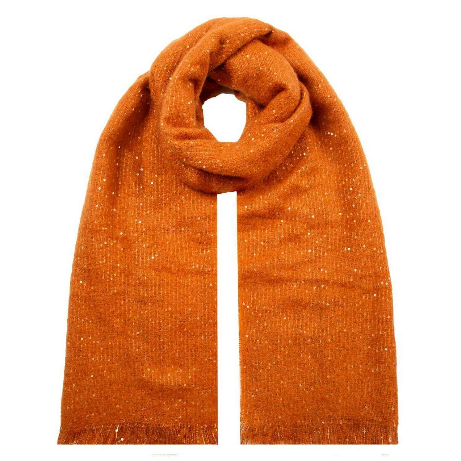 Brought to you by the brand Dents, this pumpkin orange women's sequin scarf is made from 100% polyester. It measures 180cm(height) x 50cm(width). Also the pumpkin orange scarf is designed in a plain pattern, It is recommended to hand wash only to keep this scarf in good condition. All the scarves come complete with dents tags. The Dents Sequin Scarf - Pumpkin Orange features a fun sequin orange design. This scarf is cute and bold, perfect for cold weather and adding a bit of sparkle to an everyday look. Also includes classic tassels for an added unique touch.