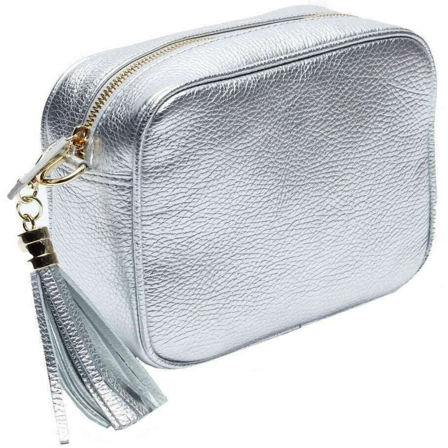 Designer Elie Beaumont has brought you this women's 100% genuine premium leather bag using silver tones. It measures 15cm(height) x 20cm(width) x 7cm(depth). All the bags come complete with elie beaumont packaging. The Elie Beaumont Crossbody Bag - Silver trendy and versatile is a must-have to add to your collection with the gorgeous and useful features. The detachable body strap can be adjusted to your liking depending on the outfit and the look you are going for perfect for all occasions. The large main compartment and interior pocket is great for optimal storage and organisation to hold everything and more that you need. The double layer reinforced base and double stitched side seams ensure this bag is durable and long-lasting. Crafted from premium grained genuine leather is complete with gold hardware and a matching detachable tassel for a girly touch.