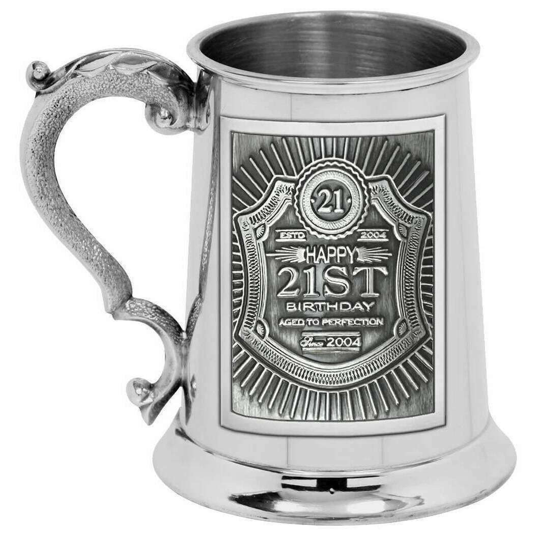 Brought to you by the brand English Pewter Company, this silver unisex embossed 21st pewter 1 pint tankard is made from pewter. It measures 12.75cm(height). English Pewter Company have made this embossed 21st pewter 1 pint tankard in Britain. All the drinkware and glassware comes complete with english pewter company packaging. The English Pewter Company Embossed 21st Pewter 1 Pint Tankard - Silver will make the perfect gift for that special birthday. It features a sturdy handle with an intricate design and offer classic appeal with its weighty finish. Fill it up with your favourite ale or craft beer and raise a toast for the special occasion. The high quality material ensures it gives off timeless charm.