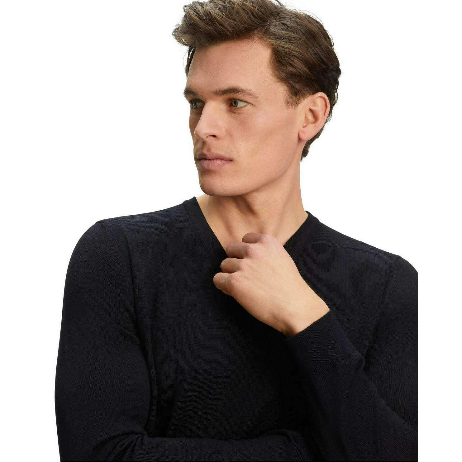 This men's merino x-fine v-neck sweater has been made from 100% virgin wool, featured in a black colour and is from the brand Falke. Also the black jumper is designed in a plain pattern, It is recommended to machine wash at 30 degrees to keep this jumper in good condition. All the jumpers come complete with falke packaging. The Falke Merino X-Fine V-Neck Sweater - Black is a must-have piece to elevate your winter wardrobe with the classic design to give that traditional touch. Crafted from mulesing-free merino wool gives a light wear perfect for mild to cold outdoor temperatures keeping you warm in the autumn and winter. Giving this sweater its fashionable look is the French shoulder seams, fine ribbed neckline and elasticated ribbed cuffs on the trunk and sleeves. The high-quality 'fully fashioned' processing gives an exclusive feel that will be enjoyed and will stay this way for many years to come.