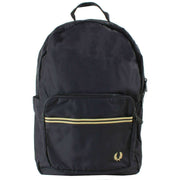 Using black 100% recycled polyamide, this tipped tape backpack by Fred Perry is perfect for men and a must have. It measures 46cm(height) x 31cm(width) x 14cm(depth). All the bags come complete with fred perry packaging. The Fred Perry Tipped Tape Backpack - Black offering everyday versatility, this backpack exudes heritage style and is durable and lightweight choice. The main section is a superb size for your things while also offering internal pockets, a padded laptop section and side compartments. The padded shoulder straps are adjustable offers natural comfort and ensuring it sits just right. It boasts a lustrous finish with signature branding to elevate the minimalist silhouette.