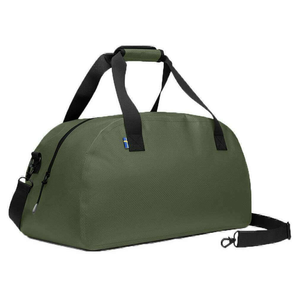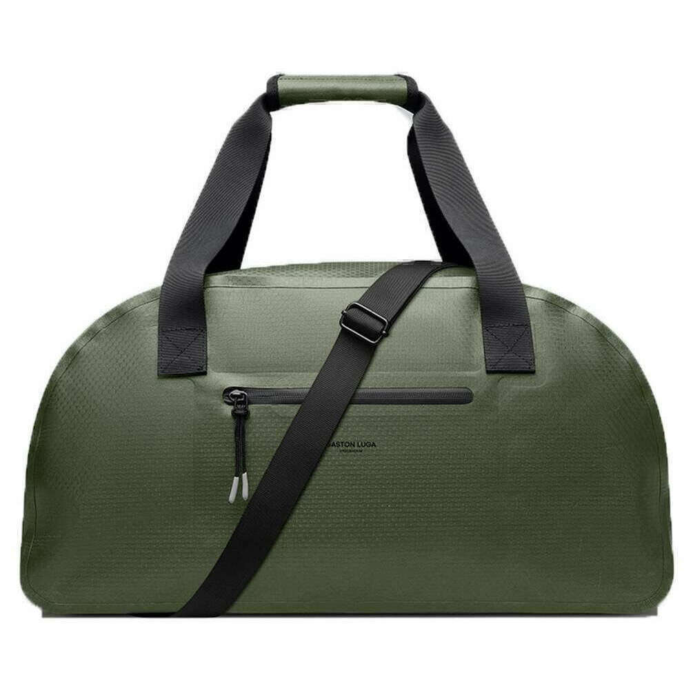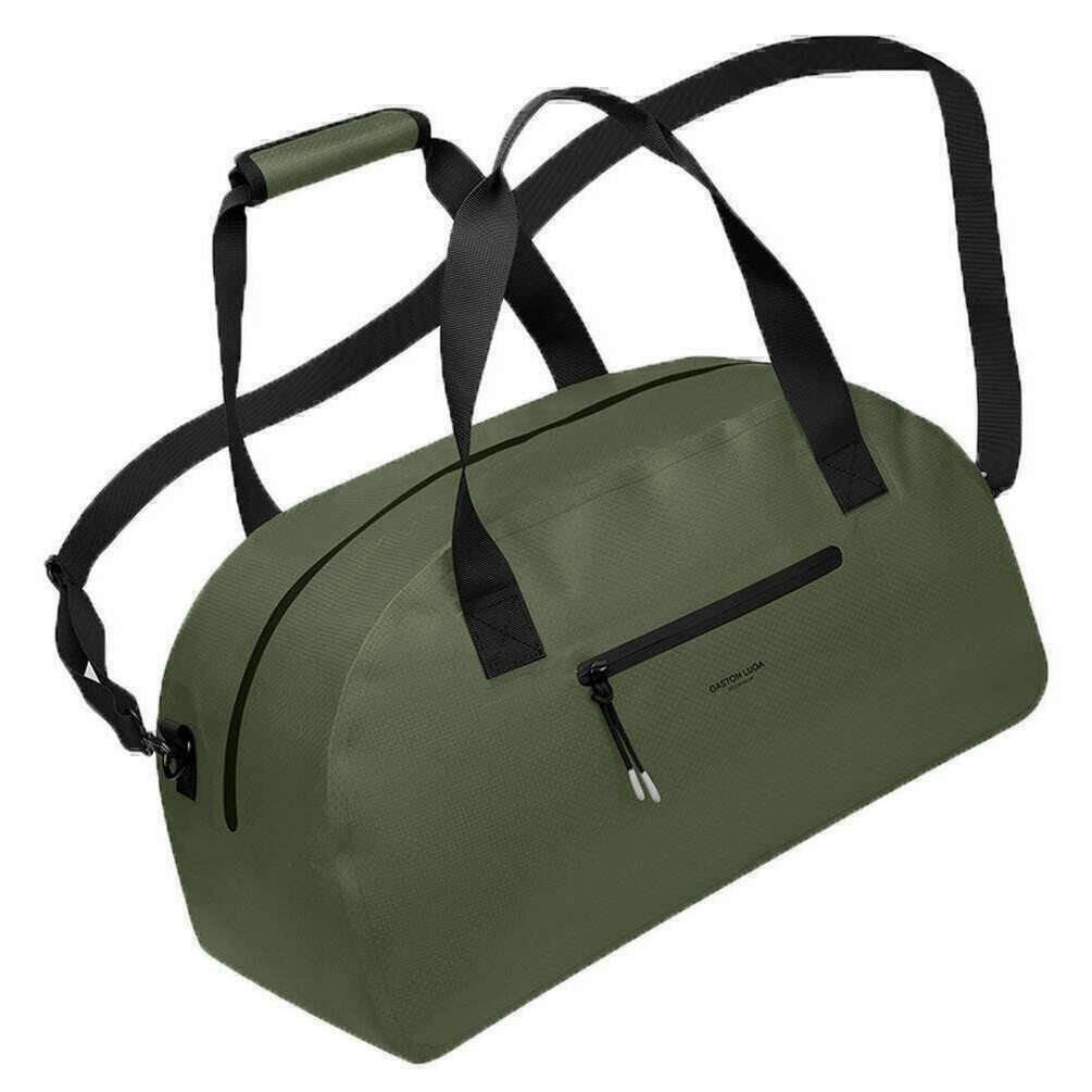 Manufactured from 100% recycled polyester is this olive green unisex lightweight duoseal duffel bag by the designer Gaston Luga. It measures 28cm(height) x 52cm(width) x 25cm(depth). It is recommended to use a simple damp cloth to keep this bag in good condition. All the bags come complete with gaston luga tags. The Gaston Luga Lightweight DuoSeal Duffel Bag - Olive Green is a versatile and eco-conscious travel companion designed for those seeking functionality without compromising on style. Featuring an outer zippered pocket and adjustable shoulder strap for comfort, this duffel bag offers ample space and durability, making it ideal for weekend getaways, gym sessions, or daily commutes. This waterproof duffel bag blends style with functionality for all your adventures.
