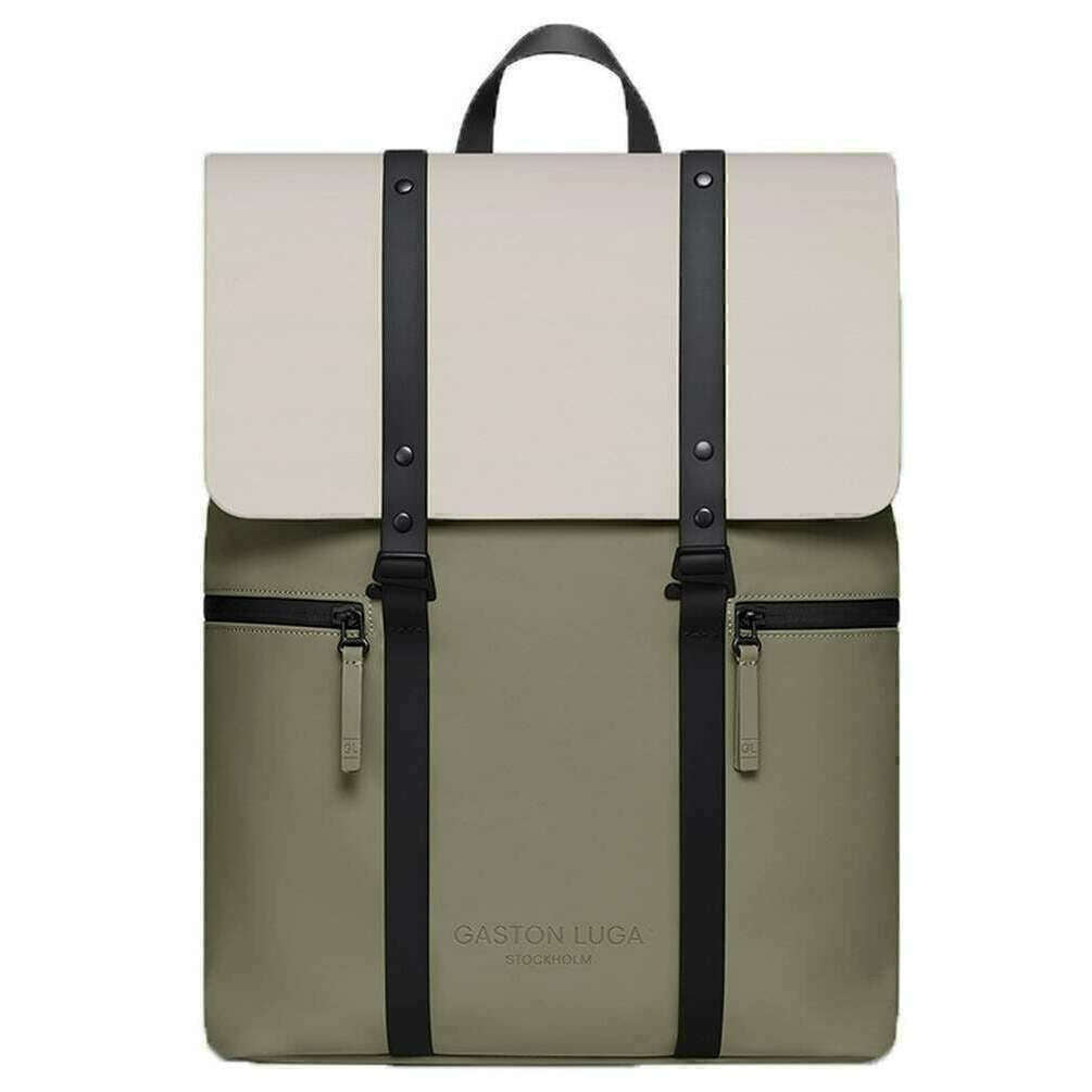 Using green 100% recycled polyester, this splash 2.0 13" backpack by Gaston Luga is perfect for men or women and a must have. It measures 40cm(height) x 28.5cm(width) x 12.5cm(depth). It is recommended to use a simple damp cloth to keep this bag in good condition. All the bags come complete with gaston luga tags. The Gaston Luga Splash 2.0 13" Backpack - Cloud Cream/Sage allows you to safeguard your device during transit with a padded compartment that snugly fits most 11"–13" laptops. The sleek double-strap flap closure keeps all your belongings secure while adding to the backpack's minimalist aesthetic. The adjustable shoulder straps and padded back panel ensure comfort during extended wear. This bag is an excellent choice for those seeking a reliable and stylish everyday backpack.
