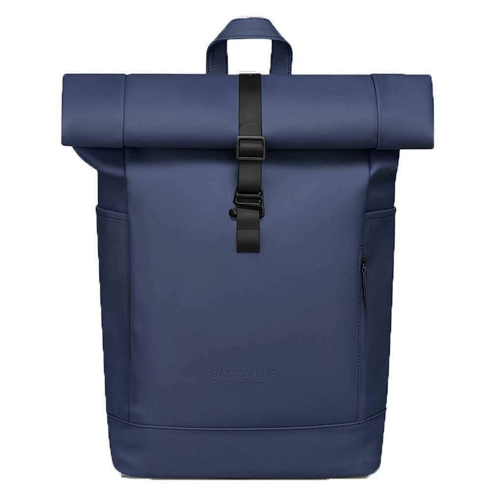 Using blue 100% recycled polyester, this splash rolltop 16" backpack by Gaston Luga is perfect for men or women and a must have. It measures 62cm(height) x 27cm(width) x 13.5cm(depth). It is recommended to use a simple damp cloth to keep this bag in good condition. All the bags come complete with gaston luga tags. The Gaston Luga Splash Rolltop 16" Backpack - Dark Blue features a main compartment that easily fits all your belongings, including laptops up to 16". Crafted from waterproof PU this backpack offers a roll-top, allowing you to adjust storage space. The adjustable shoulder straps and padded back panel ensure comfort during extended wear. With its combination of style, functionality, and eco-friendly materials, the Splash Roll-Top 16” backpack is a versatile choice for those seeking a reliable and fashionable everyday backpack.