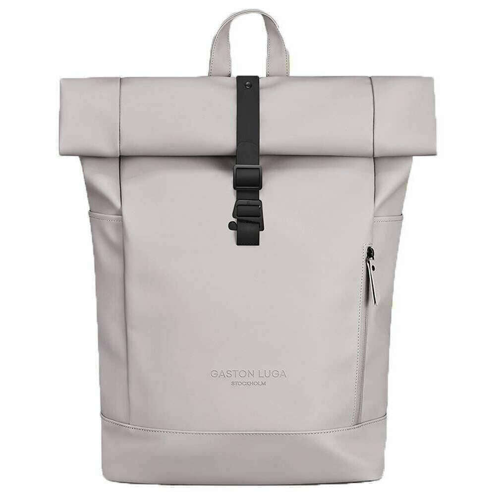 This unisex splash rolltop 16" backpack has been made from 100% recycled polyester, featured in a grey colour and is from the brand Gaston Luga. It measures 62cm(height) x 27cm(width) x 13.5cm(depth). It is recommended to use a simple damp cloth to keep this bag in good condition. All the bags come complete with gaston luga tags. The Gaston Luga Splash Rolltop 16" Backpack - Taupe Grey features a main compartment that easily fits all your belongings, including laptops up to 16". Crafted from waterproof PU this backpack offers a roll-top, allowing you to adjust storage space. The adjustable shoulder straps and padded back panel ensure comfort during extended wear. With its combination of style, functionality, and eco-friendly materials, the Splash Roll-Top 16” backpack is a versatile choice for those seeking a reliable and fashionable everyday backpack.