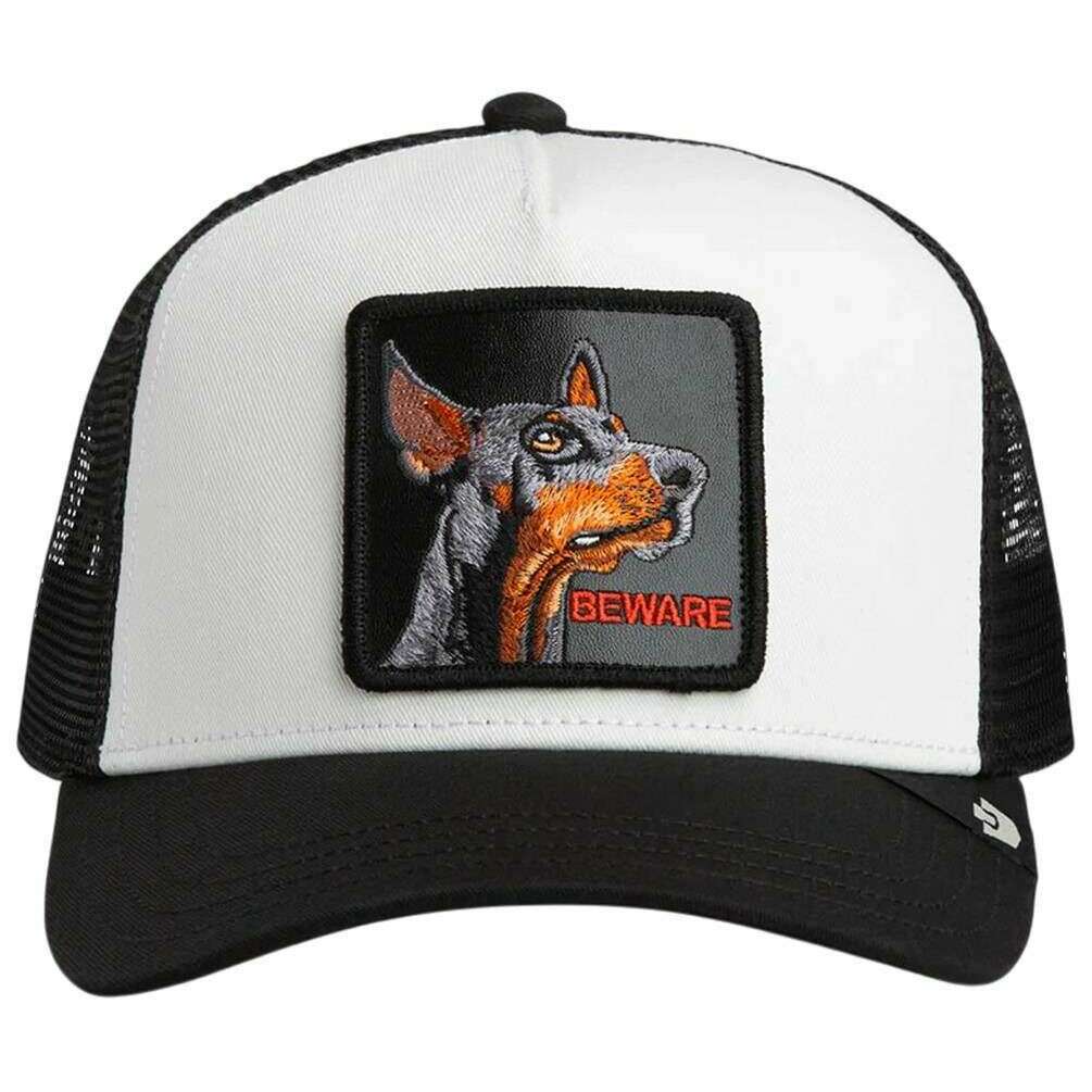 Perfect for men or women is this Goorin Bros dust white/void black beware trucker hat, it is also made from 57% polyester and 43% cotton. All the hats come complete with goorin bros tags. The Goorin Bros Beware Trucker Hat - Dust White/Void Black delivers a message of vigilance, strength, and character. This standout Goorin Bros design features a distinctive Doberman patch that instantly grabs attention and creates a powerful presence. The glossy patch showcases an intricately embroidered dog head, giving the cap a dynamic yet refined aesthetic. A crisp white front panel contrasts strikingly with the black visor and mesh back, resulting in a modern and highly expressive look. Comfort complements style, thanks to the breathable mesh insert and reliable snapback fit ideal for everyday wear. With its high?quality craftsmanship, iconic silhouette, and confident design, this cap is perfect for anyone who wants to make a bold and commanding statement.