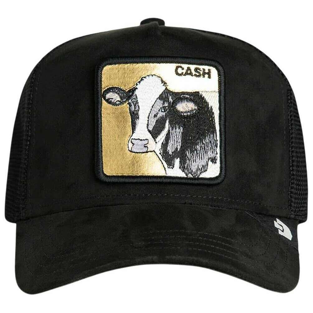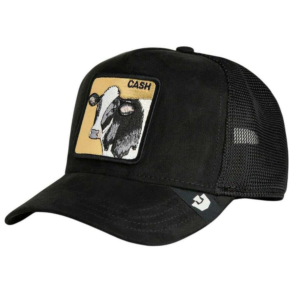Manufactured from 84% polyester and 16% cotton is this void black unisex golden cow trucker hat by the designer Goorin Bros. All the hats come complete with goorin bros tags. The Goorin Bros Golden Cow Trucker Hat - Void Black brings a touch of glamour to any outfit. This Goorin Bros design pairs a deep black base with a striking gold patch that instantly draws the eye making it a standout piece for anyone who loves expressive accessories. The intricately embroidered cow patch, finished with its distinctive gold half, gives the cap a unique and memorable look. A soft black suede front panel adds a premium feel, while the breathable mesh back ensures optimal ventilation. With its adjustable snapback closure, the cap offers a perfect, comfortable fit for everyday wear. Whether worn as a humorous statement or a stylish highlight, this cap blends confidence, coolness, and a hint of extravagance in one irresistible accessory. Perfect for anyone who loves to shine in their own distinctive way.
