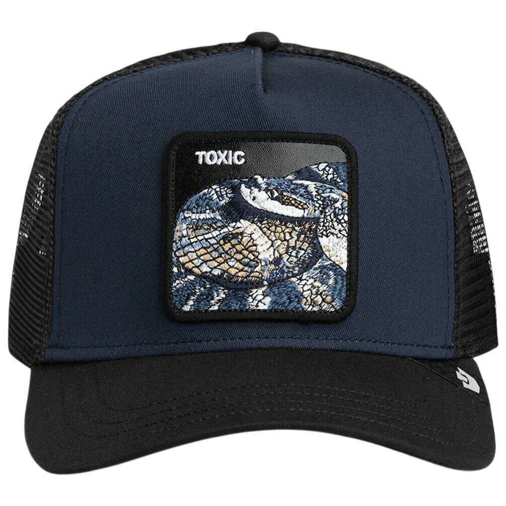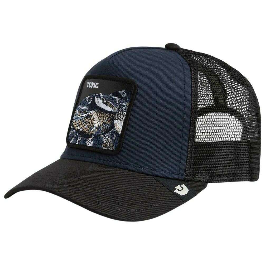 Manufactured from 57% polyester and 43% cotton is this edge navy unisex toxic trucker hat by the designer Goorin Bros. All the hats come complete with goorin bros tags. The Goorin Bros Toxic Trucker Hat - Edge Navy delivers a streetwear look that instantly commands attention. This expressive Goorin Bros design blends striking coolness with a dangerously elegant edge, creating a piece that stands out without compromise. At its core, the intricately embroidered snake patch transforms the cap into a true statement accessory, radiating intensity and distinctive character. The breathable mesh back ensures comfortable airflow throughout the day, while the adjustable snapback closure provides a perfectly customised fit for effortless wear. Crafted with high?quality materials, sharp colour contrasts, and the unmistakable Goorin Bros signature style, this cap quickly becomes an essential part of any urban outfit. A cap defined by character, attitude, and a subtle hint of danger.