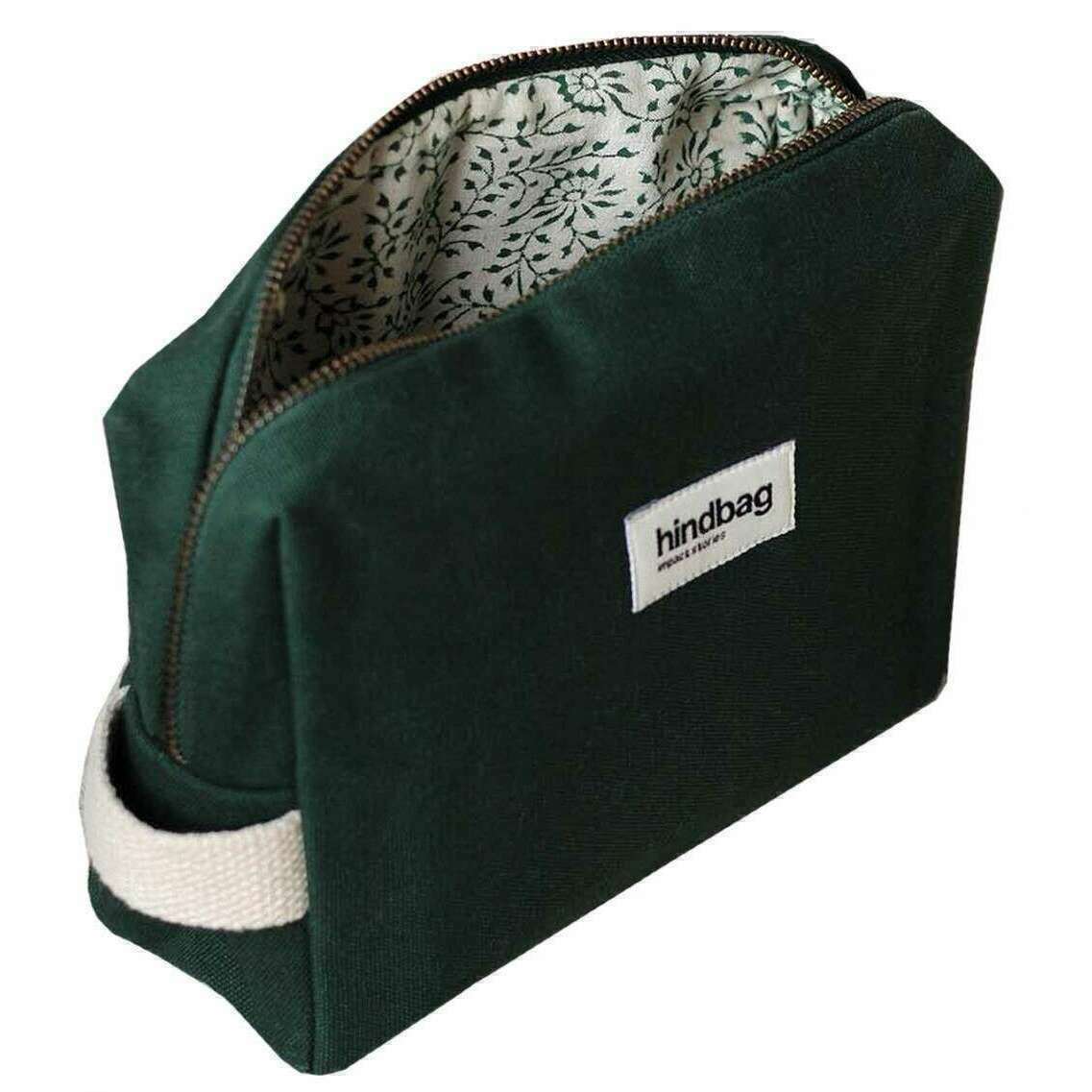 Introducing this unisex leon toiletry bag by Hindbag, it is manufactured from 100% organic cotton in a forest green colour. It measures 16cm(height) x 22cm(width) x 8cm(depth). All the bags come complete with hindbag packaging. The Hindbag Leon Toiletry Bag - Forest Green is a sleek and practical accessory designed for travellers and daily commuters who value both style and functionality. The practical handle ensures easy handling, and the secure zipper closure keeps your essentials safe. Lined with matching organic cotton in a block print pattern, this bag offers ample space for your toiletries without being bulky.
