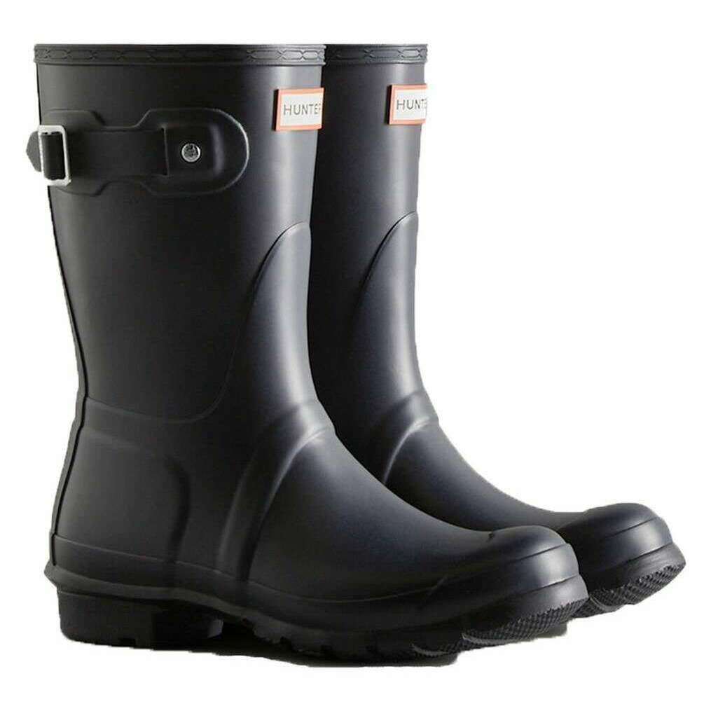 Designer Hunter has brought you this women's 100% rubber wellington boots using hunter navy tones. All the wellington boots come complete with hunter packaging. The Hunter Original Short Wellington Boots - Hunter Navy offers a compact version of Hunter s iconic Tall Boot, designed for reliable wet?weather protection. Each pair is handcrafted from 28 natural rubber parts and assembled over three days before being vulcanised for durability and waterproof performance. The boot features a matte finish, the Hunter Original tread pattern, and an updated recycled polyester lining and insole for added comfort. Specially engineered to repel water and prevent moisture seepage, this certified vegan boot is an essential choice for rainy days.