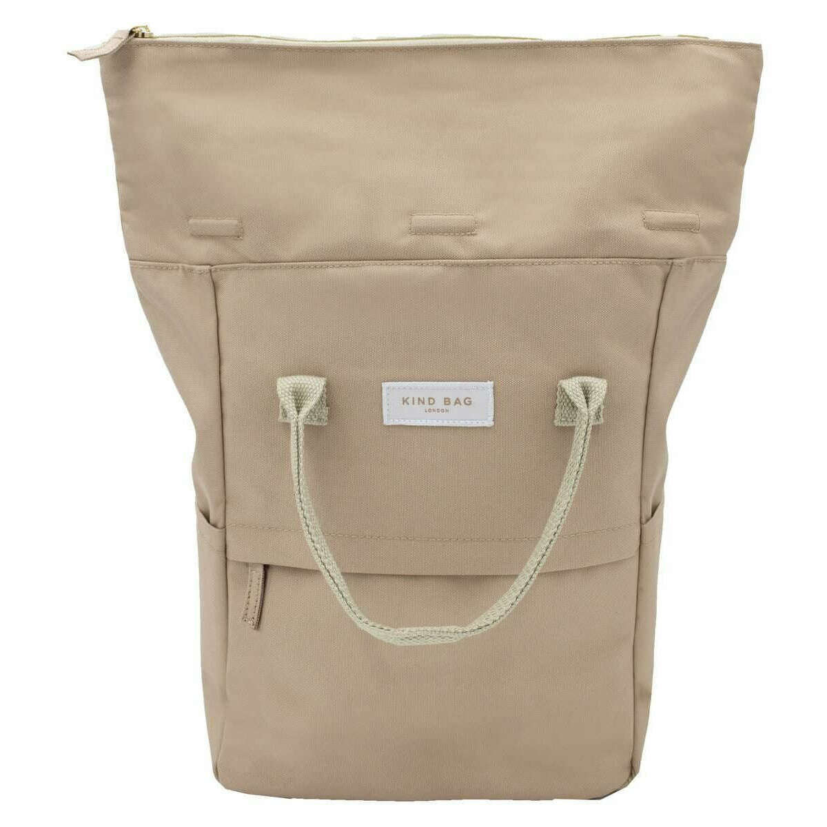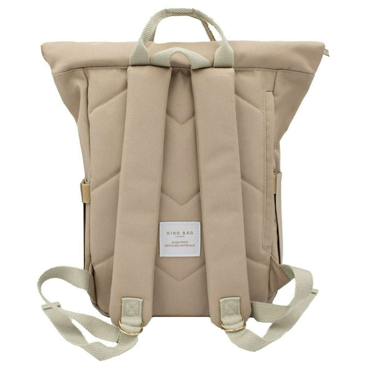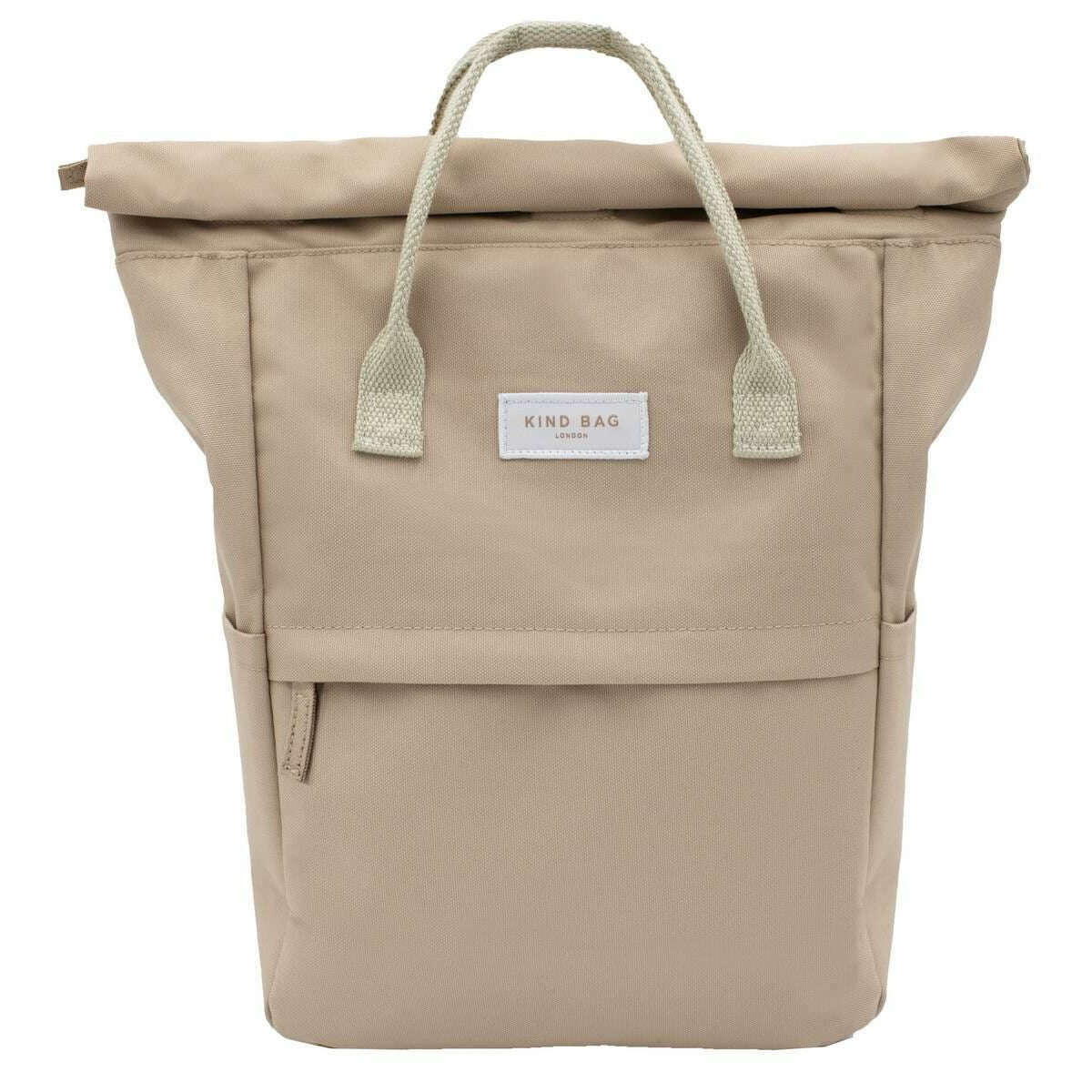 Brought to you by the brand Kind Bag London, this beige unisex hackney medium backpack is made from 100% recycled plastic. It measures 33cm(height) x 25.5cm(width) x 12.5cm(depth). All the bags come complete with kind bag london packaging. The Kind Bag London Hackney Medium Backpack - Beige is a high-quality cruelty free and vegan bag crafted from recycled plastic bottles and water-resistant fabric. This bag has lots of features that makes it the perfect fit for anyone such as hidden magnets within the handle straps to keep them together, a 12 centimetre roll top for an extendable capacity, an anti-theft pocket between the back padding and main compartment, padded back and shoulder straps for a comfortable wear, two hooks to hold keys, 2 side pockets for water bottles or umbrellas, front zipped pocket, padded laptop pocket fitting most 13" models, 2 small pockets and small zipped interior pocket. All of these features combined create the ideal backpack for your everyday adventures or travelling whilst the cute design will compliment any outfit.