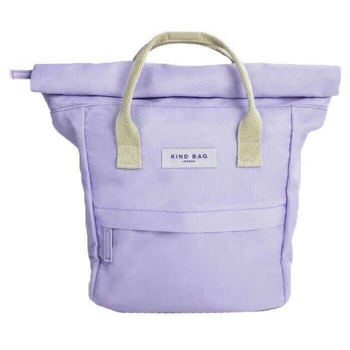 Manufactured from 100% recycled plastic is this lilac unisex hackney mini backpack by the designer Kind Bag London. It measures 26cm(height) x 22cm(width) x 12cm(depth). All the bags come complete with kind bag london packaging. The Kind Bag London Hackney Mini Backpack - Lilac is a high-quality cruelty free and vegan bag crafted from recycled plastic bottles and water-resistant fabric. This bag has lots of features that makes it the perfect fit for anyone such as hidden magnets within the handle straps to keep them together, a 12 centimetre roll top for an extendable capacity, an anti-theft pocket between the back padding and main compartment, padded back and shoulder straps for a comfortable wear, two hooks to hold keys, elastic inside to hold water bottles or umbrellas, front zipped pocket, padded back pocket for tablets, 2 small pockets and small zipped interior pocket. All of these features combined create the ideal backpack for your everyday adventures or travelling whilst the cute design will compliment any outfit.