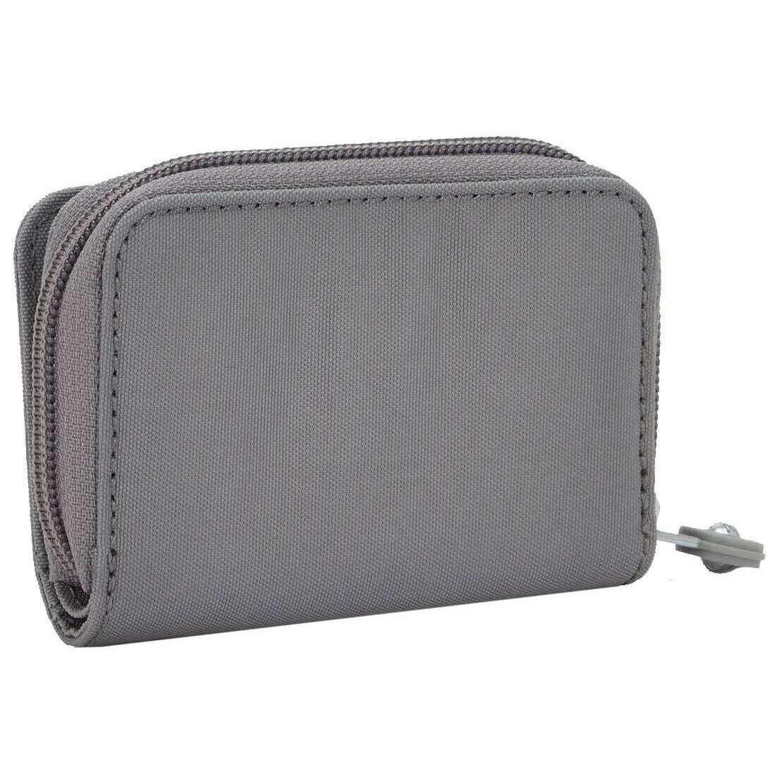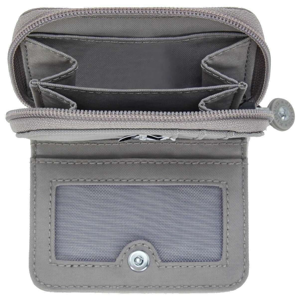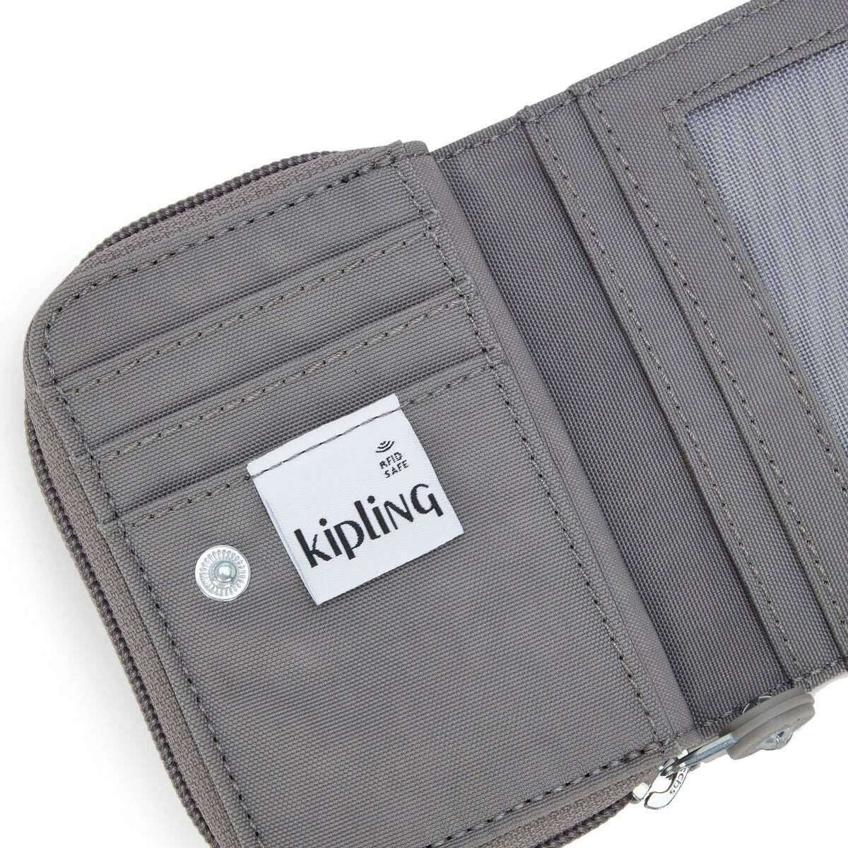 This women's tops purse by the brand Kipling is made from 60% polyamide and 40% recycled polyamide and is showcased in grey. It measures 10cm(height) x 7.5cm(width) x 2.5cm(depth). All the purses come complete with kipling packaging. The Kipling Tops Purse - Inviting Grey is a small, compact wallet designed to be practical and handy. Great for everyday use, travel, or if you carry just the essentials, this wallet fits easily in a handbag, small backpack, or even a coat pocket. Offering a practical layout with four credit card slots, two coin pockets, two receipt holders, and an ID slot for your driver's license or work ID, all secured by a top zip closure and press stud, this wallet is a must have for travellers and anyone on the go.