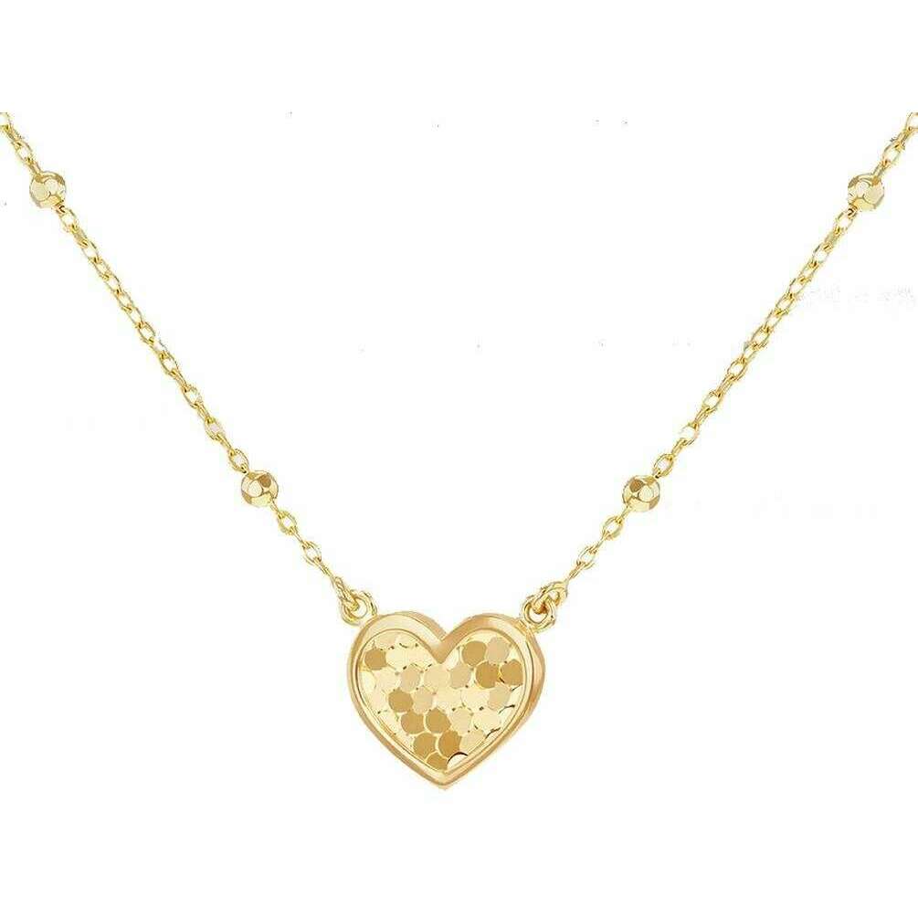 Introducing this women's disco heart adjustable trace and ball necklace by KJ Beckett, it is manufactured from 9ct yellow gold in a yellow gold colour. All the necklaces come complete with packaging. The KJ Beckett Disco Heart Adjustable Trace and Ball Necklace - Yellow Gold adds a touch of sparkle to your everyday style! Featuring a beautifully textured heart motif with a high-shine, faceted finish, this design reflects the light for a subtle yet eye-catching shimmer. Suspended from a delicate trace and ball chain, this disco heart necklace makes a charming addition to any jewellery collection.
