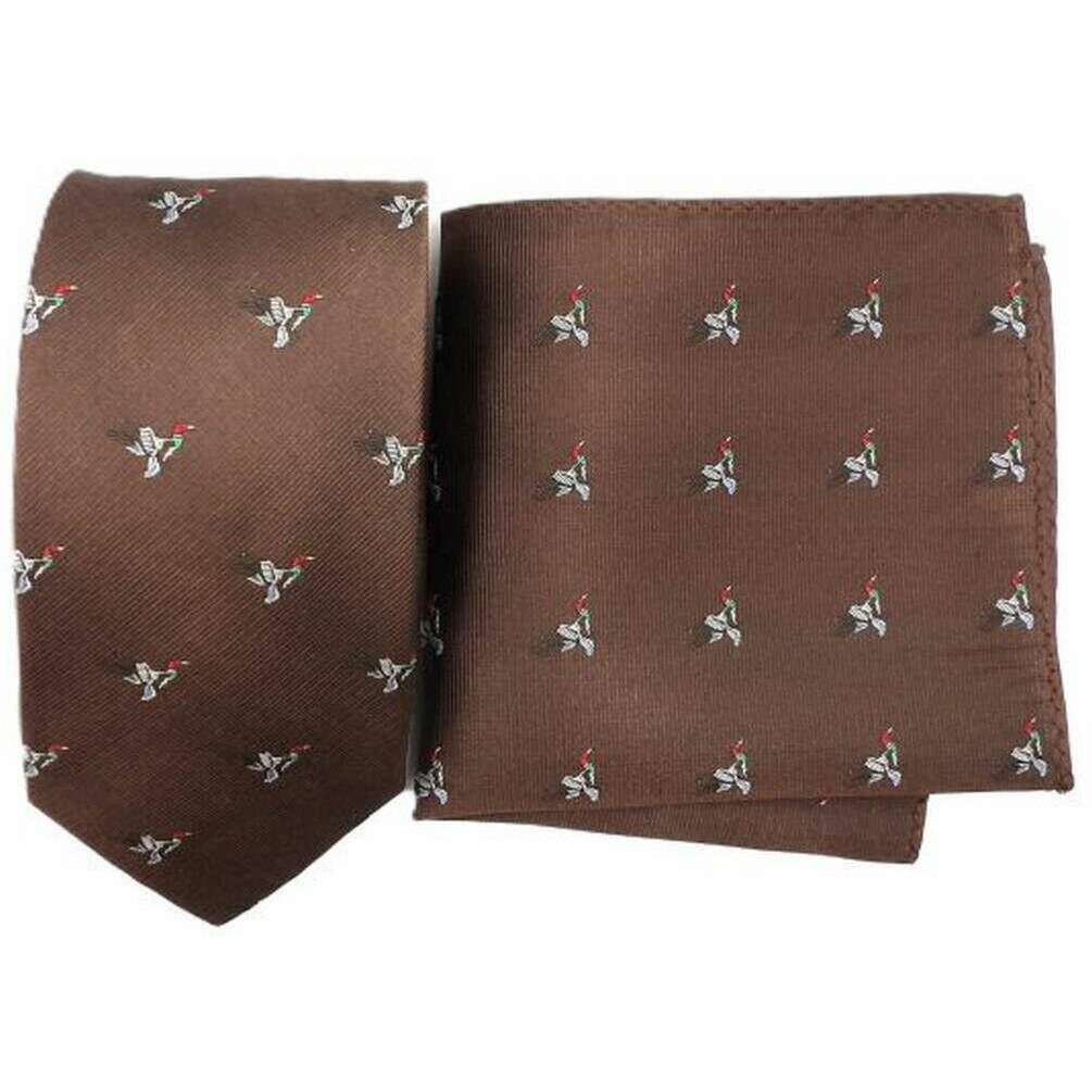 Introducing this men's duck silk tie and pocket square set by Knightsbridge Neckwear, it is manufactured from 100% silk in a brown colour. Also the brown tie and pocket square set is designed in a unique pattern, It is recommended to dry clean only to keep this tie and pocket square set in good condition. All the tie and pocket square sets come complete with knightsbridge neckwear presentation box The Knightsbridge Neckwear Duck Silk Tie and Pocket Square Set - Brown a unique brown duck design that will be certain to impress any stylish gentleman. This tie and pocket square is ideal to wear for any occasion, adding a dash of colour to your attire at the same time.