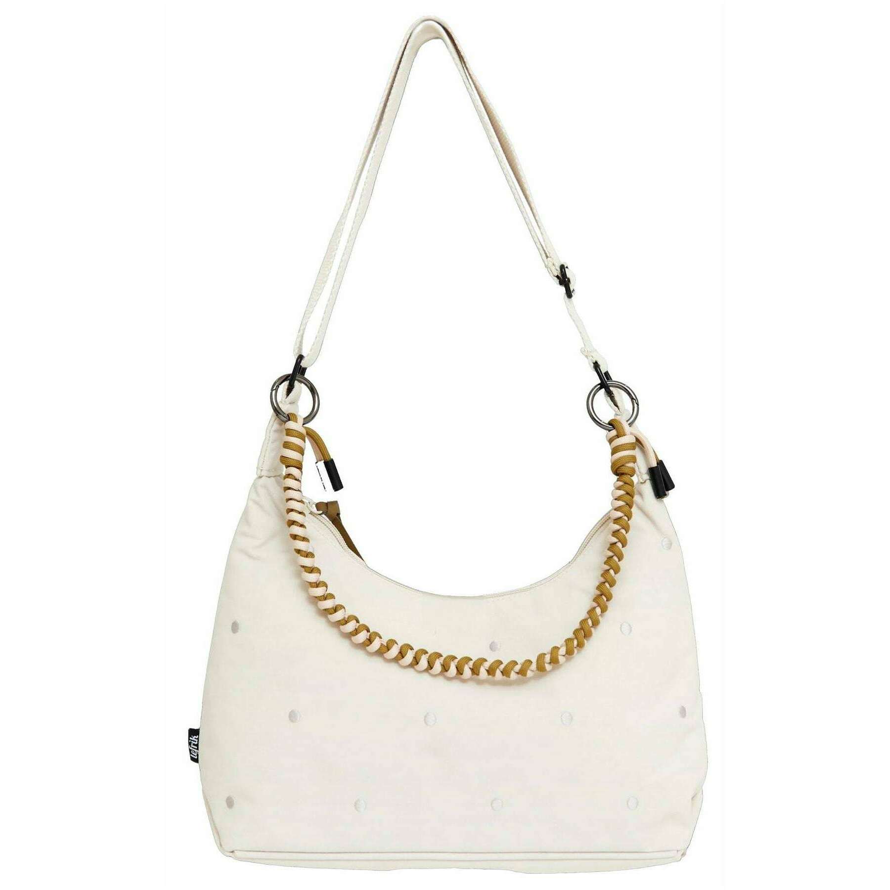 This arles bico shoulder bag for women is fashioned by the brand Lefrik in a cream colour and is made from 100% vegan oxford rpet polyester. It measures 28cm(height) x 17cm(width) x 8cm(depth). It is recommended to cold wash and air dry to keep this bag in good condition. All the bags come complete with lefrik packaging. The Lefrik Arles Bico Shoulder Bag - Ecru Dots Cream is a modern, eco-conscious accessory that seamlessly blends style with sustainability. Designed with a subtle crescent shape, this bag offers ease of carrying. With ample space for your essentials, this shoulder bag features an adjustable strap, braided shoulder strap, an easy zip closure and one zipped inner pocket to make sure you can keep your belongings organized. Whether you're navigating city streets or enjoying a weekend getaway, this bag is ideal for both everyday errands and casual outings. Featuring water-resistant canvas for added texture and sophistication, this bag is completely vegan.