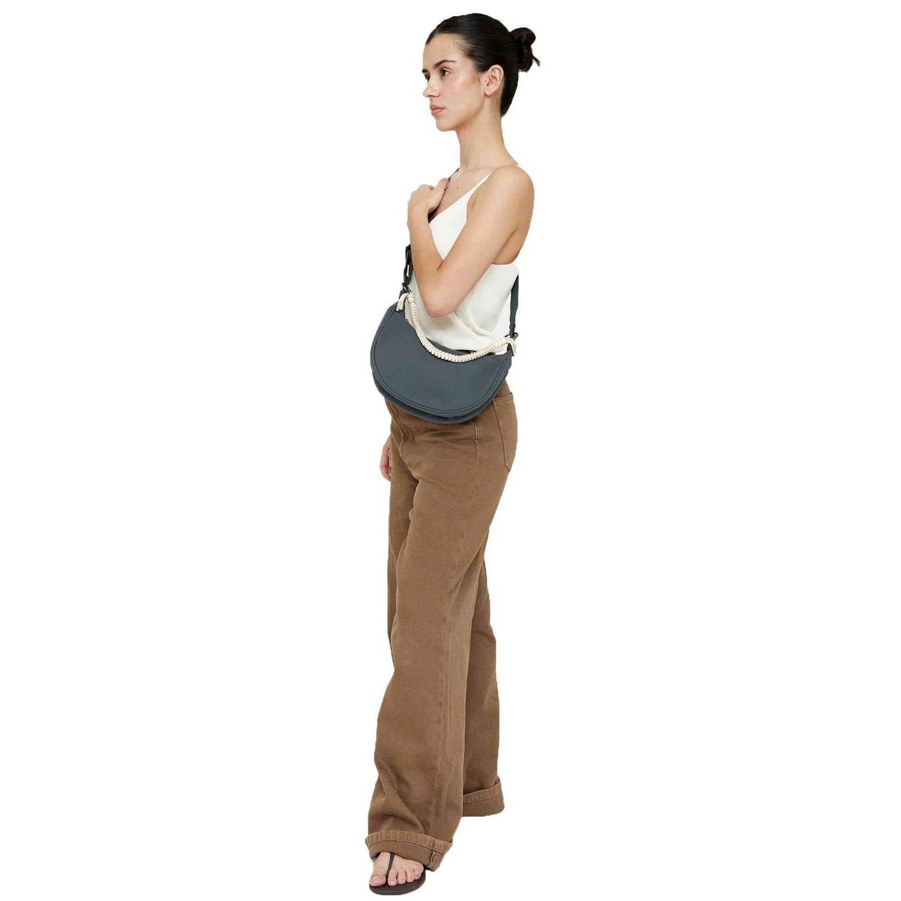 This women's arles lua shoulder bag by the brand Lefrik is made from 100% vegan oxford rpet polyester and is showcased in green. It measures 21cm(height) x 18.3cm(width) x 5.5cm(depth). It is recommended to cold wash and air dry to keep this bag in good condition. All the bags come complete with lefrik packaging. The Lefrik Arles Lua Shoulder Bag - Laurel Leaf Green is a stylish and versatile accessory designed to add a pop of colour and functionality to your wardrobe. This half-moon bag with zippered closure also features an inner zipped pocket to keep your belongings safe and accessible. Its sleek and modern design, exuding contemporary elegance with an adjustable cotton webbing strap and braided top handle, which allows you to customize the fit to your preference. You can wear it comfortably over the shoulder or across the body for hands-free convenience. Featuring water-resistant canvas for added texture and sophistication, this bag is completely vegan.